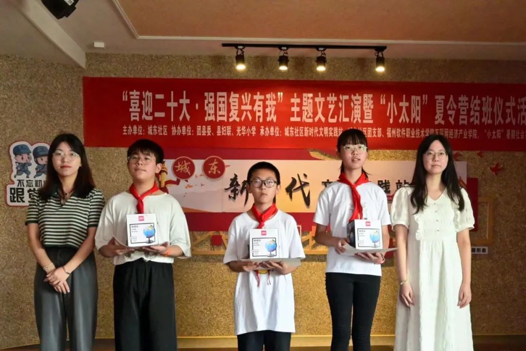 为深入落实习近平总书记关于青年工作的重要思想,以实际行动迎接党的二十大,深入开展“强国复兴有我”群众性主题宣传教育活动,进一步深化拓展新时代文明实践活动形式,激发引导我县青少年热爱生活、热爱艺术的丰富情感,营造“关心、重视”儿童健康成长的浓厚氛围,8月17日,屏南团县委联合县妇联、城东社区新时代文明实践站、光华小学以及福州软件职业技术学院互联网经济产业学院暑期“小太阳”社会实践队开展“喜迎二十大·强国复兴有我”主题文艺汇演暨“小太阳”夏令营结班仪式活动。