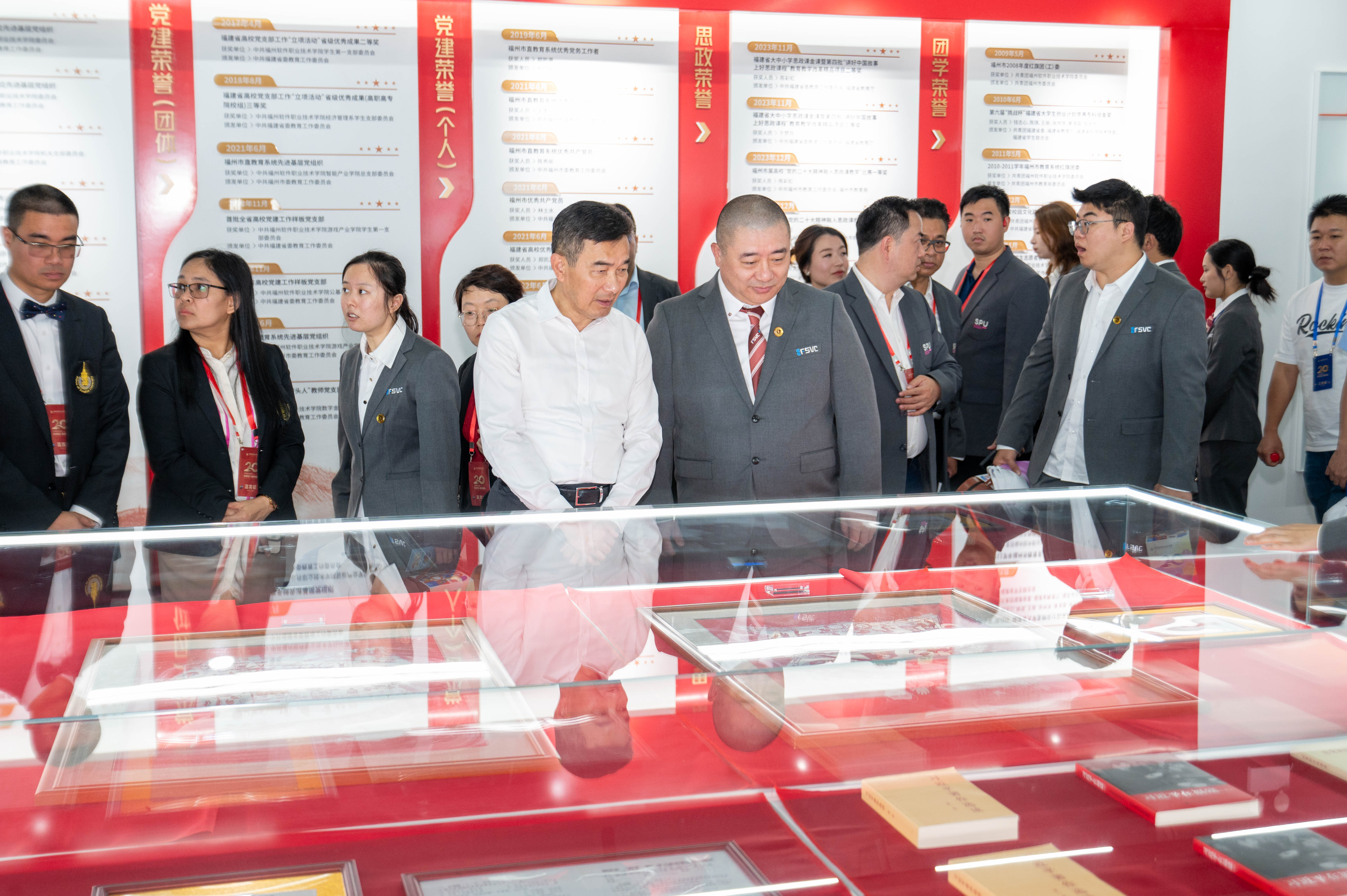 启动仪式结束后,学校理事长俞飚与学校第一任党委书记吴彬镪为学校展览馆揭牌,福州市委教育工委副书记,市教育局党组成员、副局长念琪与学校党委书记林莺为“元宇宙”思政育人创新实践基地揭牌。