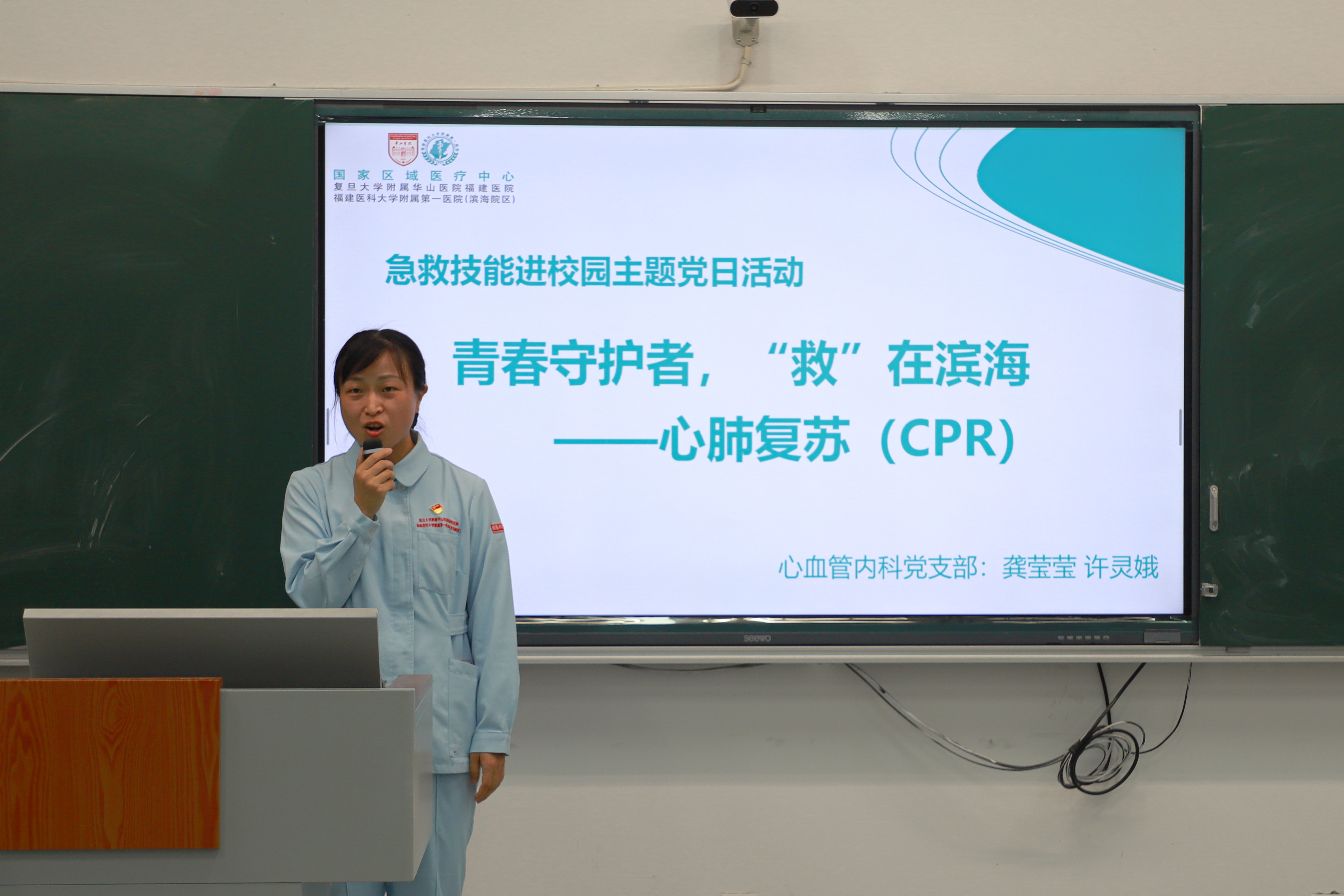活动伊始,复旦大学附属华山医院(福建医院)护理部执行主任汪慧娟发表致辞。她表示,作为医护工作者,她深知生命救援 “黄金四分钟” 的珍贵;作为共产党员,更牢记 “人民至上、生命至上” 的初心使命,希望通过本次活动,让党员先锋作用扎根服务群众第一线,让急救知识成为校园安全的坚实防线。