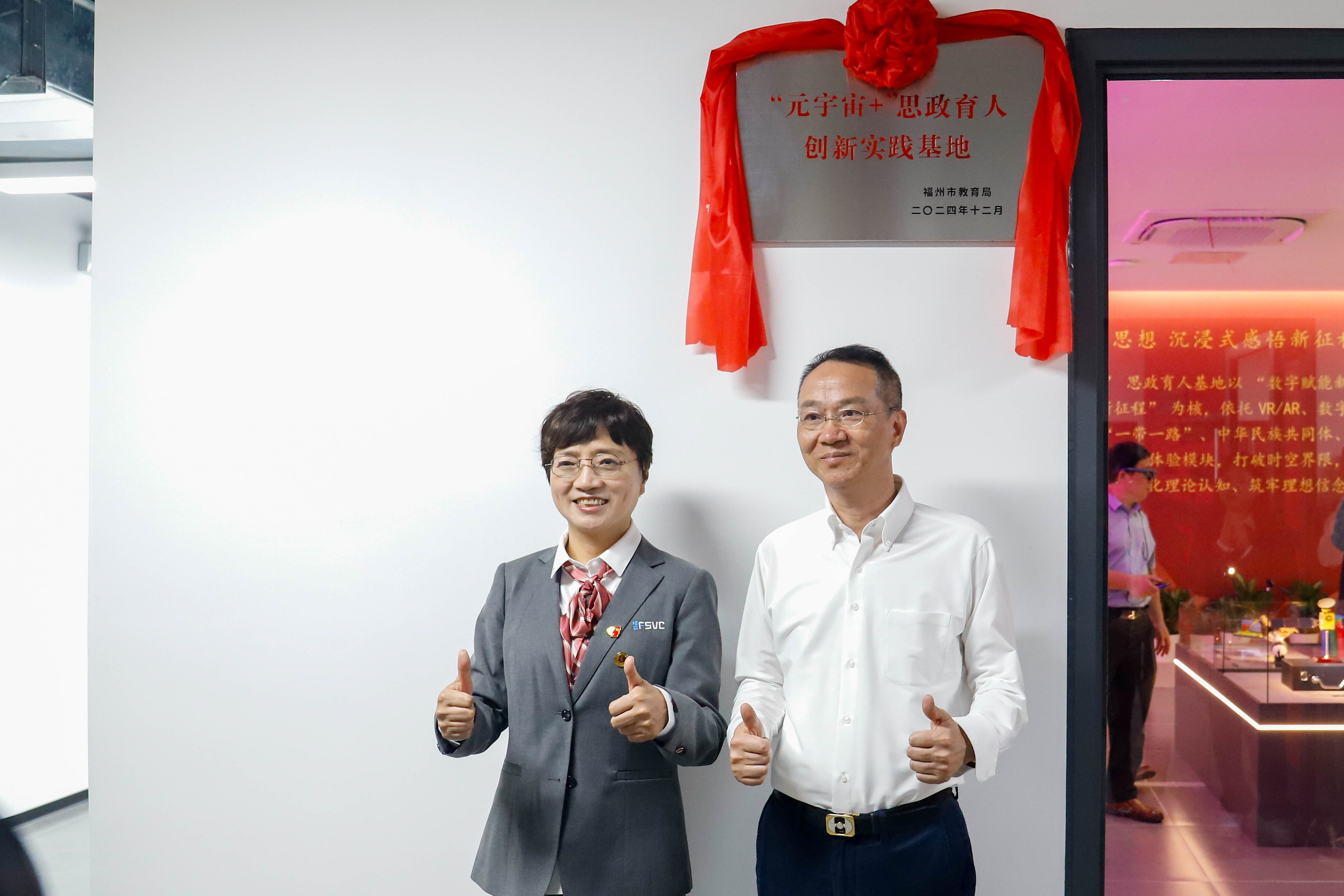 启动仪式结束后,学校理事长俞飚与学校第一任党委书记吴彬镪为学校展览馆揭牌,福州市委教育工委副书记,市教育局党组成员、副局长念琪与学校党委书记林莺为“元宇宙”思政育人创新实践基地揭牌。