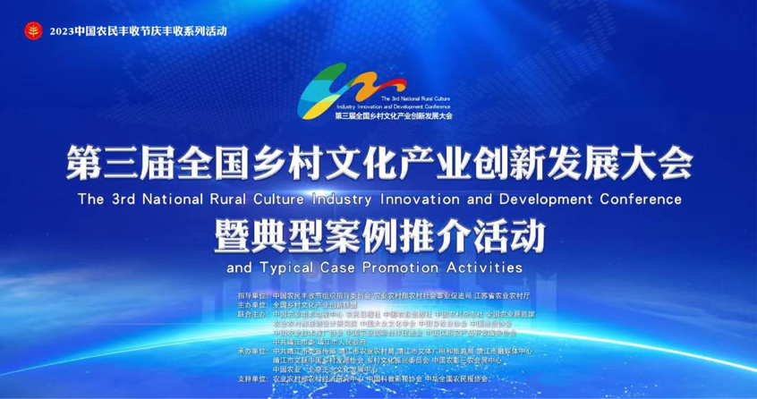 《第三届全国乡村文化产业创新发展大会暨典型案例推介活动》作为2023年中国农民丰收节庆丰收系列活动事项,是由中国农民丰收节组织指导委员会办公室、农业农村部农村社会事业促进司、江苏省农业农村厅指导,由全国乡村文化产业创新联盟主办,中国农业电影电视中心、农民日报社、中国农业出版社、中国农村杂志社、全国农业展览馆、农业农村部规划设计研究院、中国大众文化学会、中国畜牧业协会、中国渔业协会、中国农业技术推广协会、中国农业国际合作促进会、中国优质农产品开发服务协会等十二家成员单位和中共靖江市委、靖江市人民政府联合主办,由农业农村部农村经济研究中心、中国科教影视协会、中华全国农民报协会支持,由中国乡村发展协会乡村文化振兴委员会、中国农影三农会展中心、中共靖江市委宣传部、靖江市农业农村局、靖江市文体广电和旅游局、靖江市融媒体中心、靖江市文联、中国农业·北京正念文化发展中心承办,旨在征集、梳理、总结和推广新时代新征程农业农村现代化进程中全国各地文化产业赋能乡村振兴的宝贵经验和创新探索,激活新动能新活力,拓展新业态新空间,推动乡村文化产业升级发展,助力品牌强农建设,促进农文旅融合及特色发展。