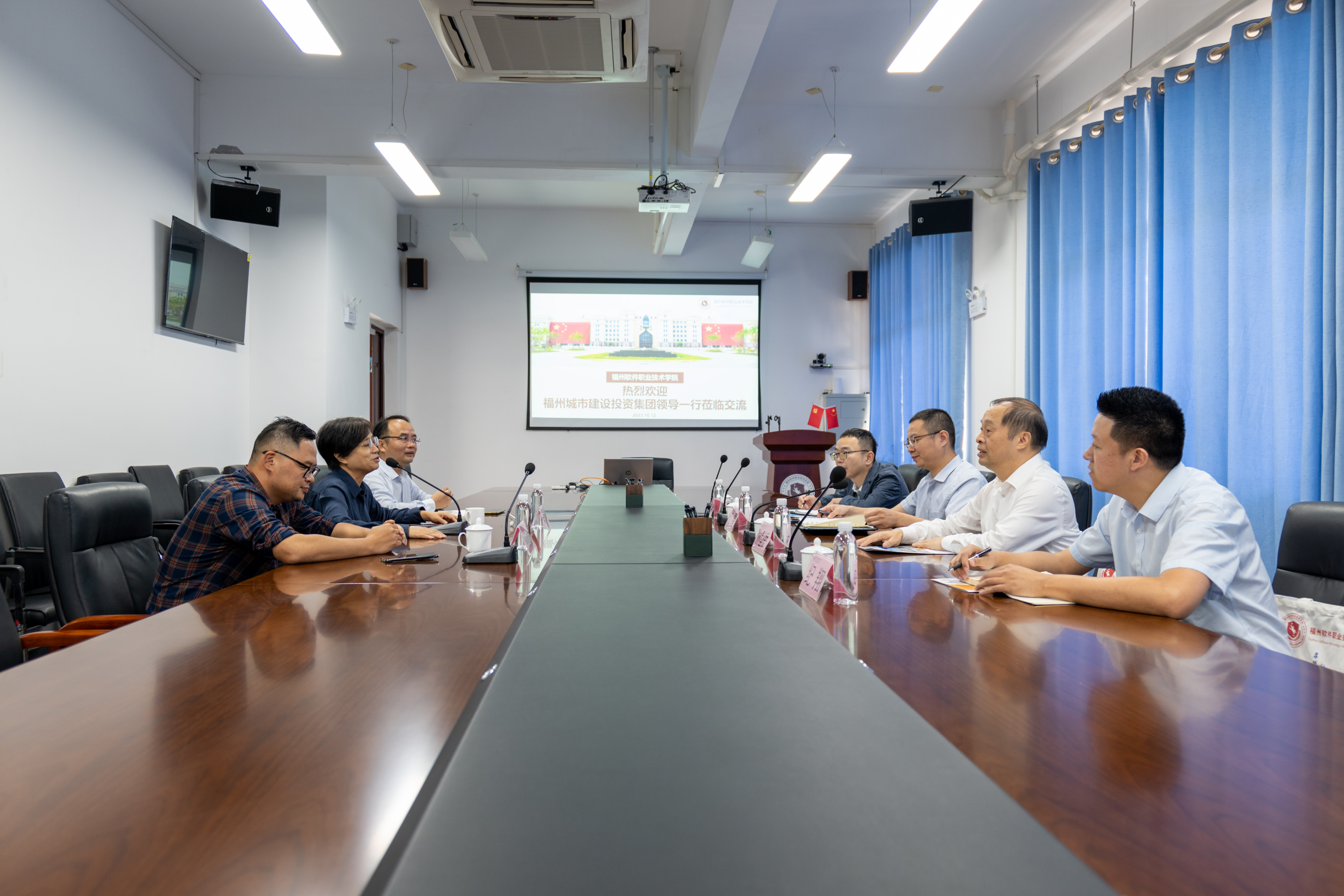 2023年10月12日上午,福州城投集团党委副书记林型岳,福州城投新基建集团党支部书记、执行董事、总经理江星,副总经理纪翔,首席信息官林宇一行4人莅临我校开展调研交流工作。学校党委书记林莺,校长助理柯建琳,职业培训处处长夏副顺等相关领导陪同调研交流。