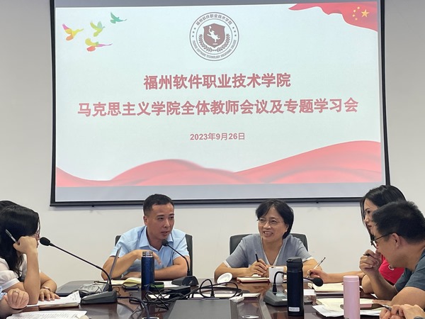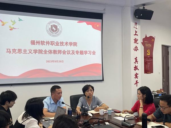 2023年9月26日下午,福州软件职业技术学院马克思主义学院于学校党员活动室举行2023-2024学年第一学期全院教职工大会。学校党委书记林莺、马克思主义学院院长吴海礁、副院长叶镇国和各课程教研室主任及教研室成员参加了大会,大会由副院长叶镇国主持。