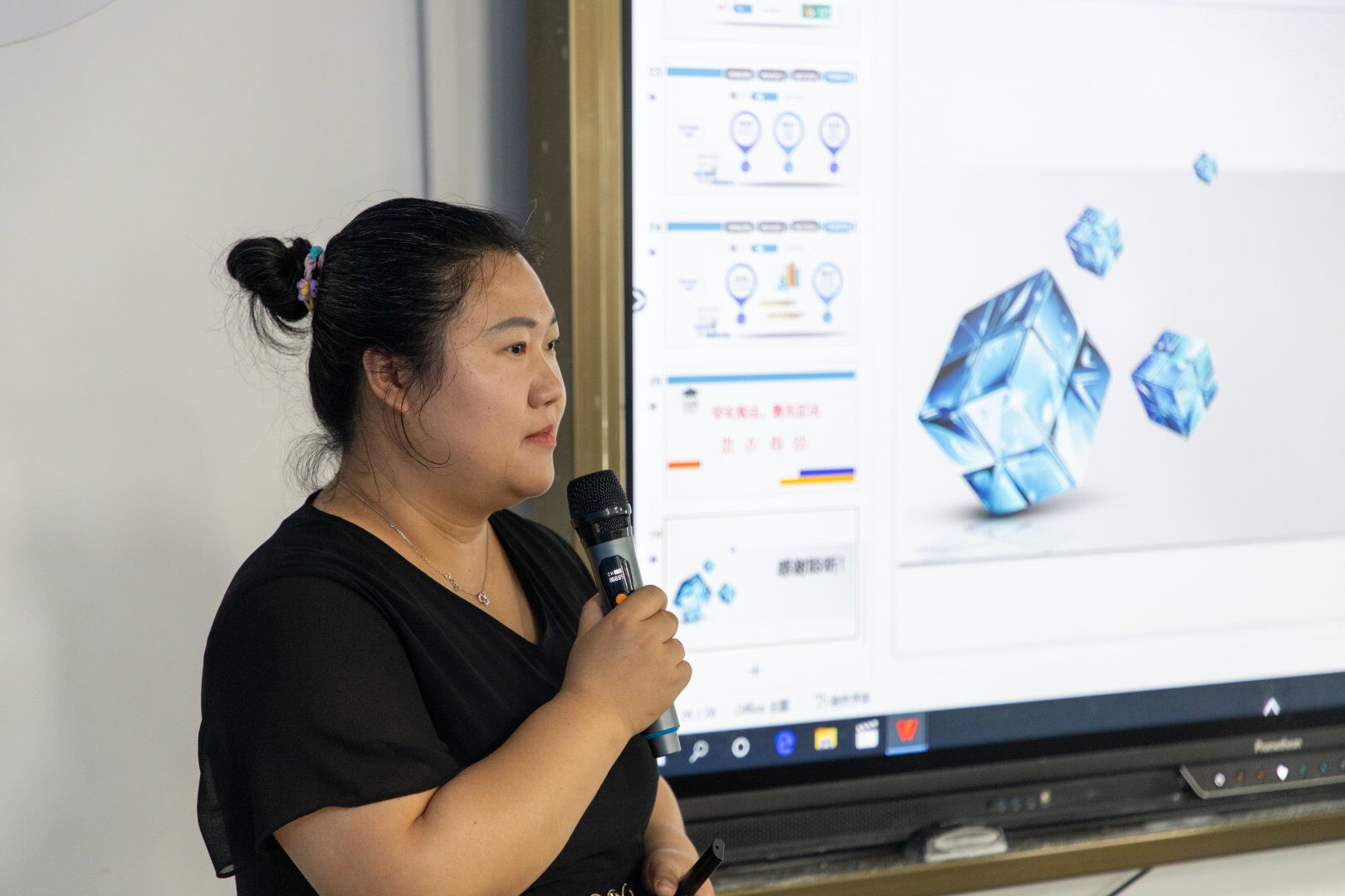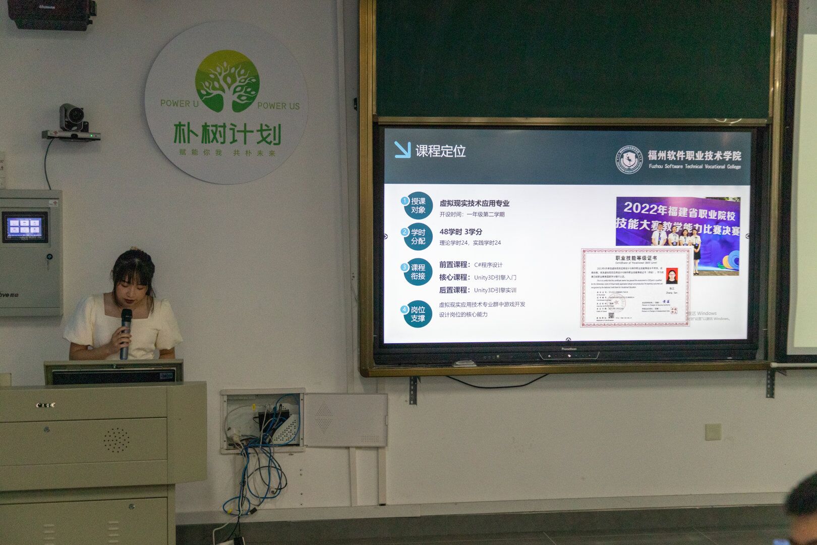 竞赛现场,各位参赛教师依次上台“说课程”,他们从容有度、自然流畅,从课程目标、教学设计、特色创新与成效等方面入手,结合行业最新动态与生源类型特点,课程结构重点突出、课件制作新颖丰富、教学思路清晰、语言形象生动,将枯燥深奥的理论知识变得生动有趣、浅显易懂。最终,经过学校专家评审团队综合打分,来自游戏产业学院的王昕妍老师获得了“说课程”竞赛一等奖。