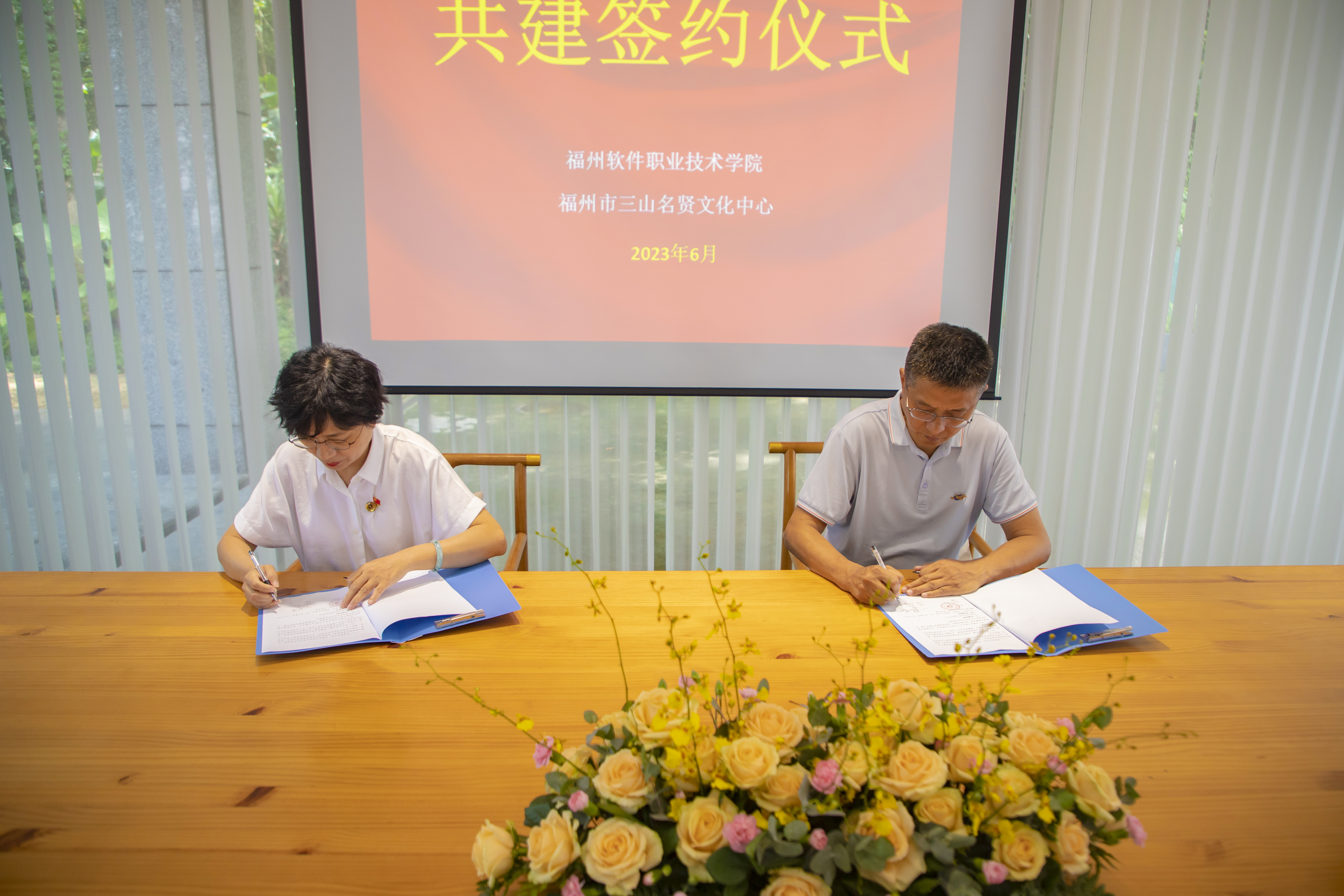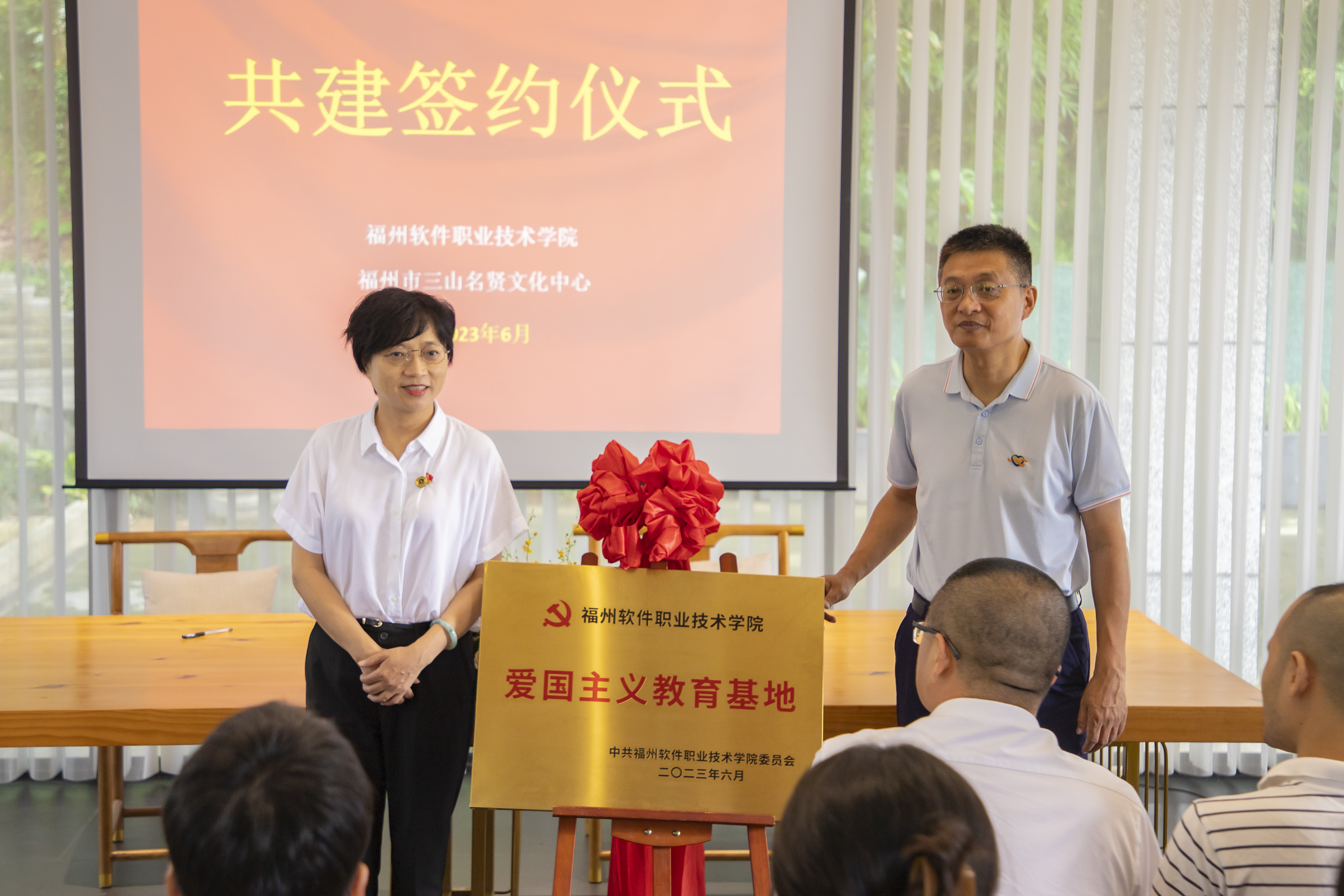 共建仪式上,福州三山人文纪念园副总经理杨继忠从福州三山人文纪念园的历史、文化、人文、意义四个方面全面介绍了园区的概况。林艺勇副书记就我校的基本情况、专业特色以及可深度合作的领域做了介绍,并表示期待双方充分发挥各自优势、加强交流合作,共同为数字福州、数字福建贡献力量。随后,林莺书记与杨继忠副总经理分别代表双方进行共建签约和揭牌。