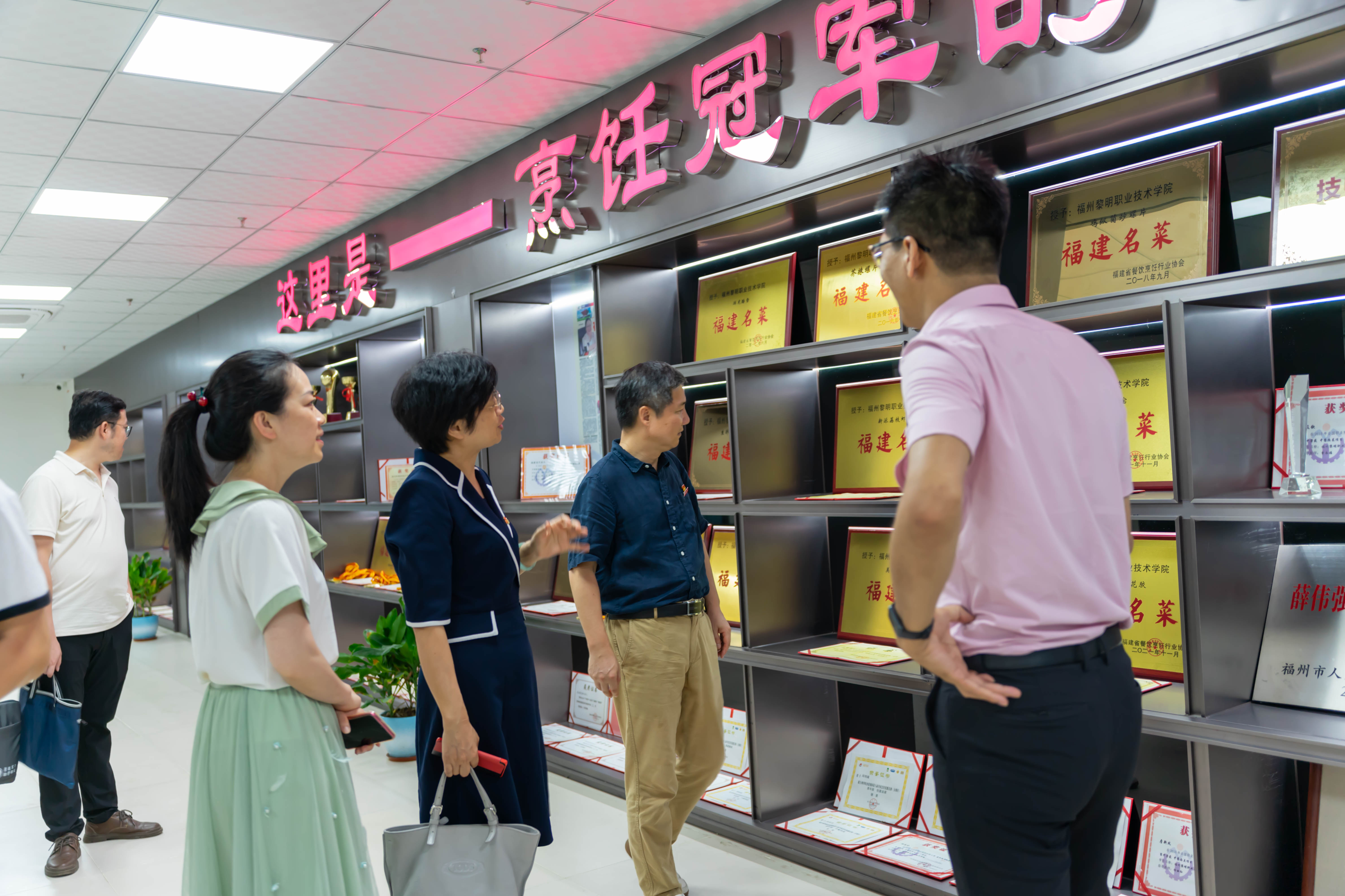 交流会后,林莺书记一行在福州黎明职业技术学院校领导的陪同下,先后参观了图书馆、曼奇培训部、劳动教育基地、福屿校区的烹饪生产性实训基地、学校荣誉馆等。