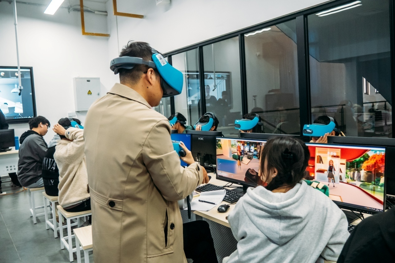 党的二十大报告把教育、科技、人才进行“三位一体”统筹安排、一体部署,将“推进教育数字化”写入报告,体现了以习近平同志为核心的党中央的重大战略部署,赋予了教育在全面建设社会主义现代化国家中新的使命任务。教育部要求纵深推进教育数字化发展,把数字化转型作为职业教育整体性、系统性变革的内生变量,用数字化思维系统谋划和推动职业教育改革发展。元宇宙是整合多种新技术而产生的新型虚实相融的互联网应用和社会形态,正加速向教育领域的应用渗透。虚拟现实技术作为元宇宙核心技术之一已成为数字经济的重大前瞻领域,其产业发展战略窗口期已然形成。基于对元宇宙行业未来工作岗位的分析和学生职业生涯持续发展的关注,同时结合职教元宇宙课堂模型,在网龙网络公司的支持下,福州软件职业技术学院携手华中师范大学于2022年12月7日—8日,在福州软件职业技术学院教学楼D210(游戏产业学院新媒体研创中心),成功开展了两堂生动有趣的《虚拟现实概论》——“元宇宙”实验公开课。