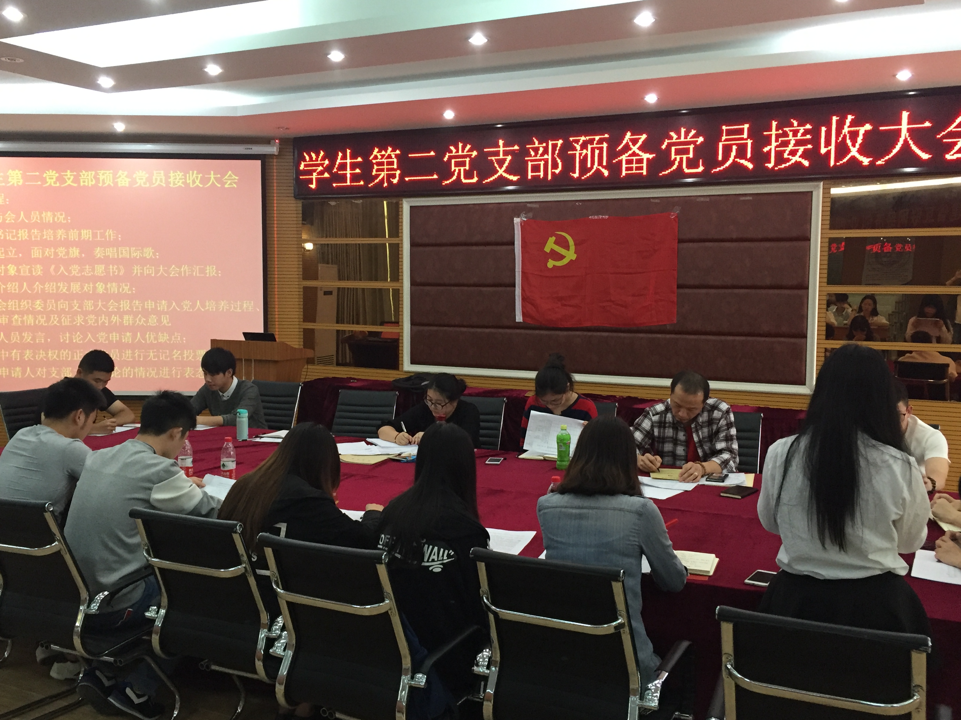 此次大会主要内容为讨论并表决关于骆德灿等七位发展对象的入党问题。大会开始,全体起立奏唱国际歌,接着入党申请人逐一宣读入党志愿书并表明自己的入党动机,简明扼要地汇报了考察期间个人在思想态度、生活、学习、工作等方面的突出表现,充分体现了他们加入中国共产党的强烈愿望,同时由他们对应的入党介绍人对其学习、工作、实践活动等方面进行评价。随后拥有表决权的党员对七位入党申请人进行无记名投票,与会正式党员一致同意接收骆德灿等七位同志成为中共预备党员。会上学院党委洪志群副书记围绕“大学生党员如何发挥先锋模范作用”作了具体指导。最后,学生第二党支部书记王李沙老师对大会进行了总结,希望大家不仅要在组织上入党,更重要的是在思想上入党,要不断提高自身的党性修养,认真学习专业知识,提高自身就业本领,争取在思想、学习、工作、生活等方面切实履行党员的义务和责任,充分发挥党员先锋模范作用。