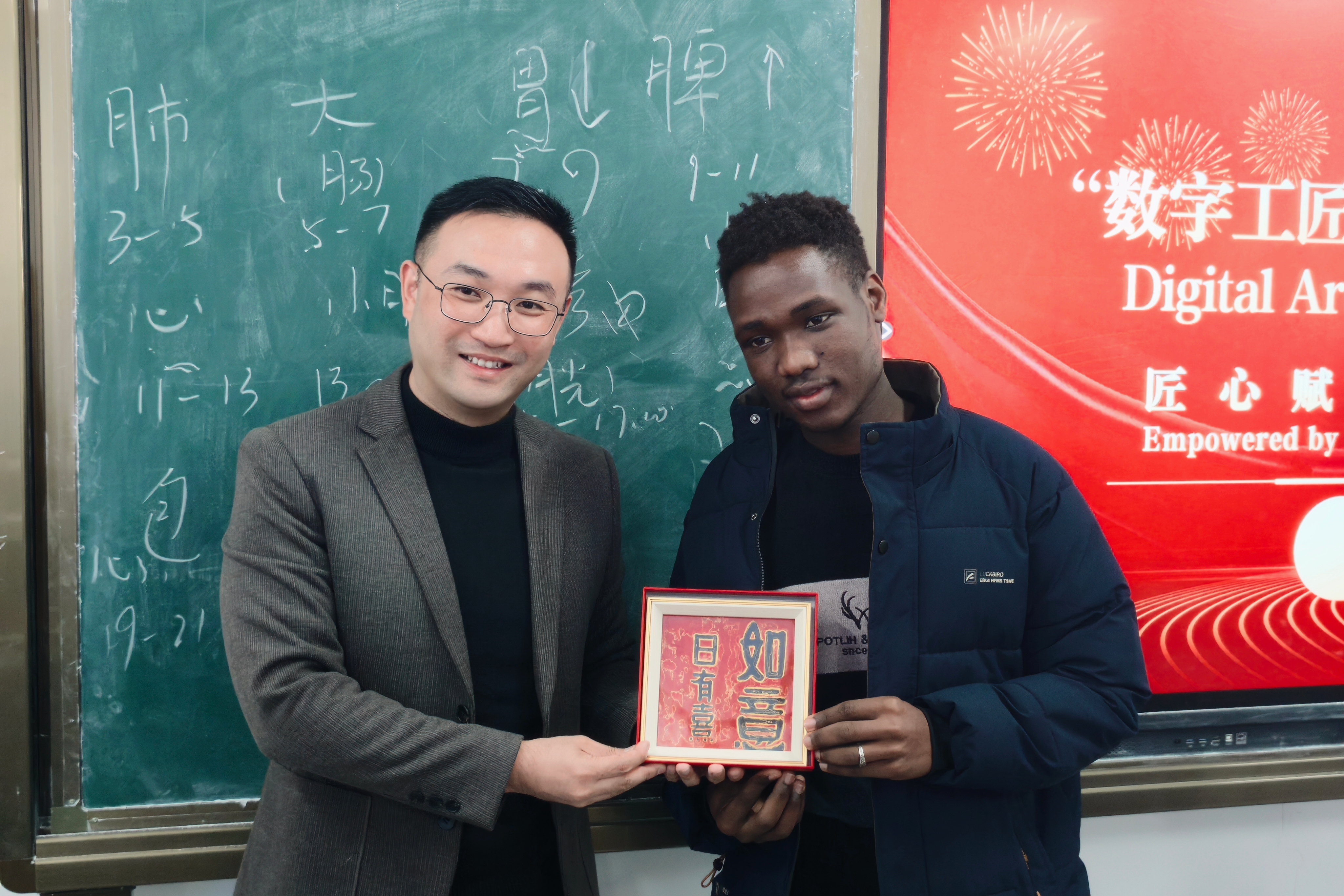 在活动尾声的特别环节中,袁帅老师为三位在互动中表现积极的国际语言学生颁发了非遗漆画纪念品。这份融合传统工艺与现代审美的礼物,不仅是对学生热情参与的嘉奖,更是中华优秀传统文化的一份可触可感的传承,象征着匠心精神在国际语言学生间薪火相传。