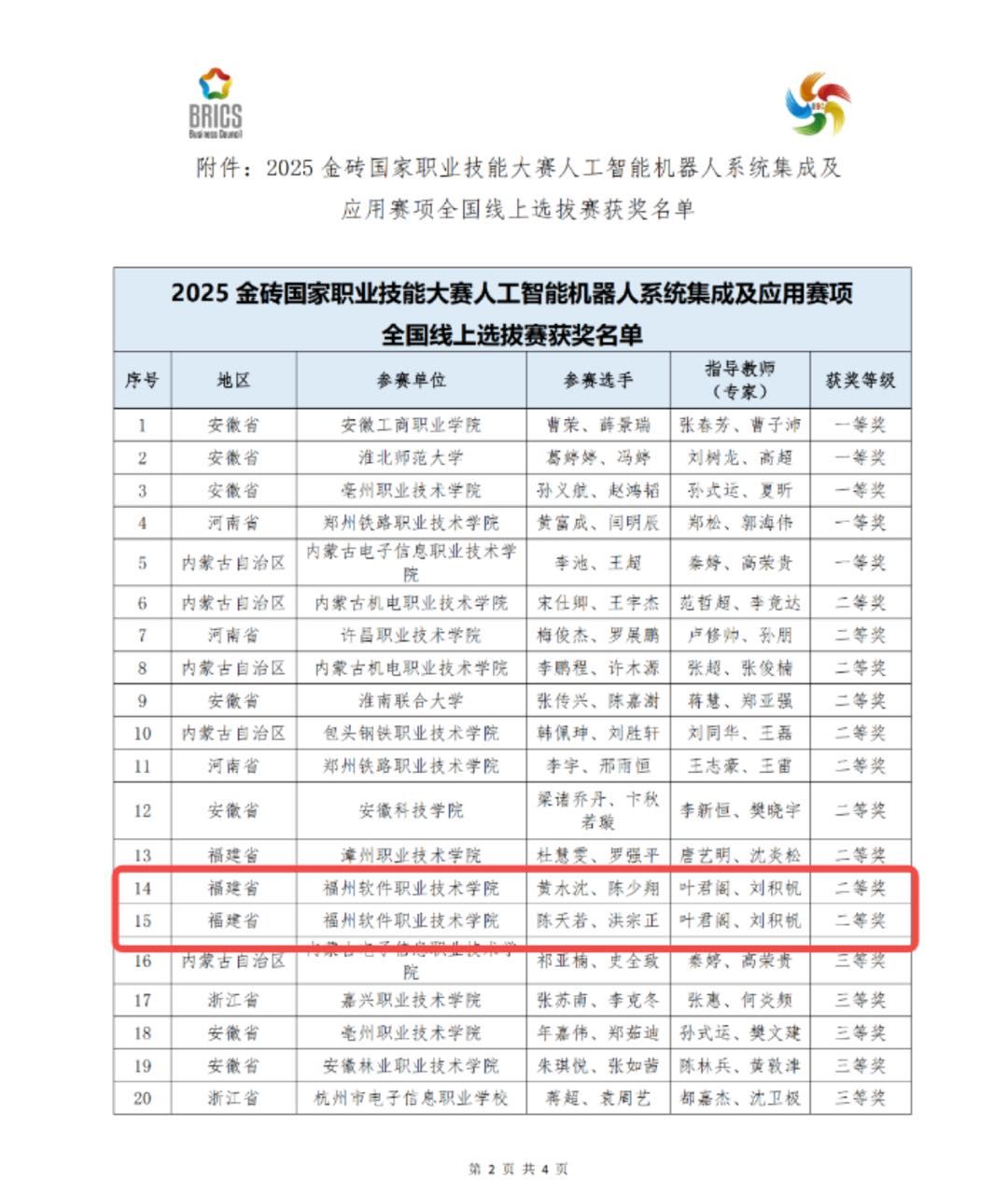 2025年12月2日,2025金砖国家职业技能大赛人工智能机器人系统集成及应用赛项全国线上选拔赛圆满落幕。我校未来技术产业学院学子黄水沈、陈少翔、陈天若、洪宗正等凭借扎实的专业功底、精湛的实操技能和默契的团队协作,在众多参赛队伍中脱颖而出,成功斩获二等奖,同时顺利晋级该赛项国际总决赛,为学校赢得了荣誉。