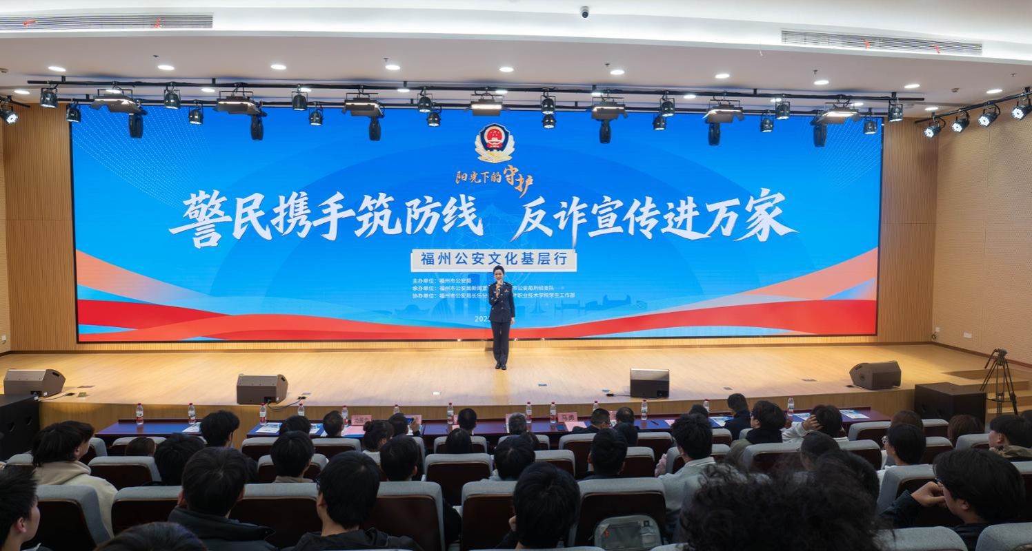 为持续推进校园反诈宣传教育走深走实,切实提升广大师生防范电信网络诈骗的意识和能力,共同筑牢校园安全防线,2025年12月23日,“阳光下的守护”警民携手筑防线 反诈宣传进万家暨福州公安文化基层行活动在我校图书馆八楼报告厅举办。福州市公安局新闻宣传处处长张乃忠、福州市公安局长乐分局政委陈雄、长乐分局刑侦大队大队长涂龙瑞、阜山海防派出所所长池振忠等领导出席活动,学校党委书记马勇、党委副书记林艺勇陪同,各学院师生代表共同参与这场反诈宣传盛会。