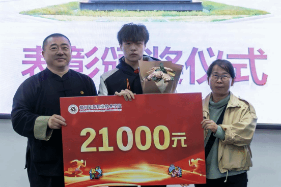 林艺勇副书记首先宣读了表彰决定,对刘晨廷同学取得的突出成绩予以高度肯定。随后,俞飚理事长为其颁发奖金、献上鲜花。