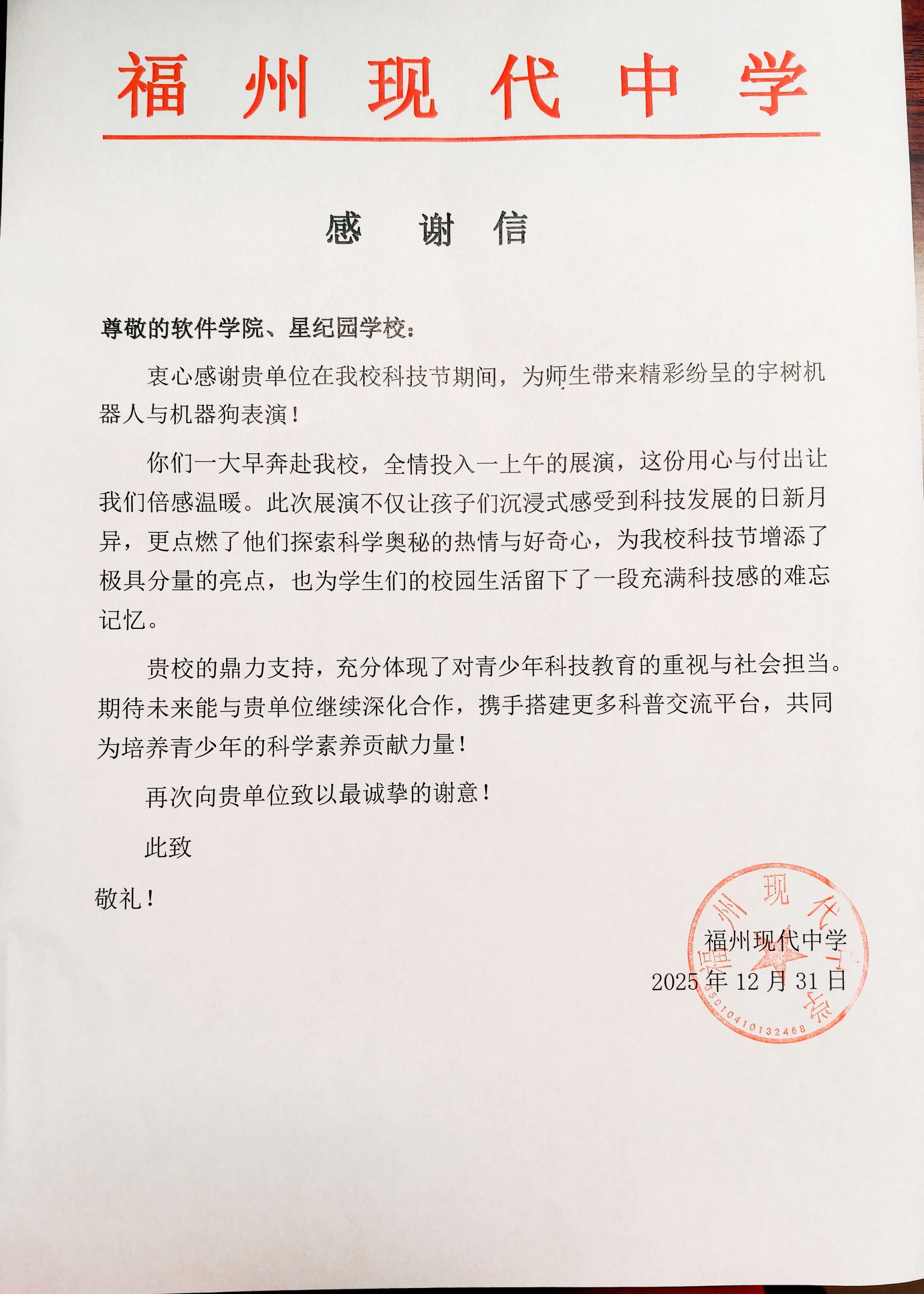 此次跨学段联动,构建了“高校专业引领、中学协同落地、学生深度参与”的科普教育模式。福州现代中学在活动后向两校致信感谢,充分肯定了活动在激发中学生科创兴趣、培养高校学生实践能力与社会责任感方面的双重价值。