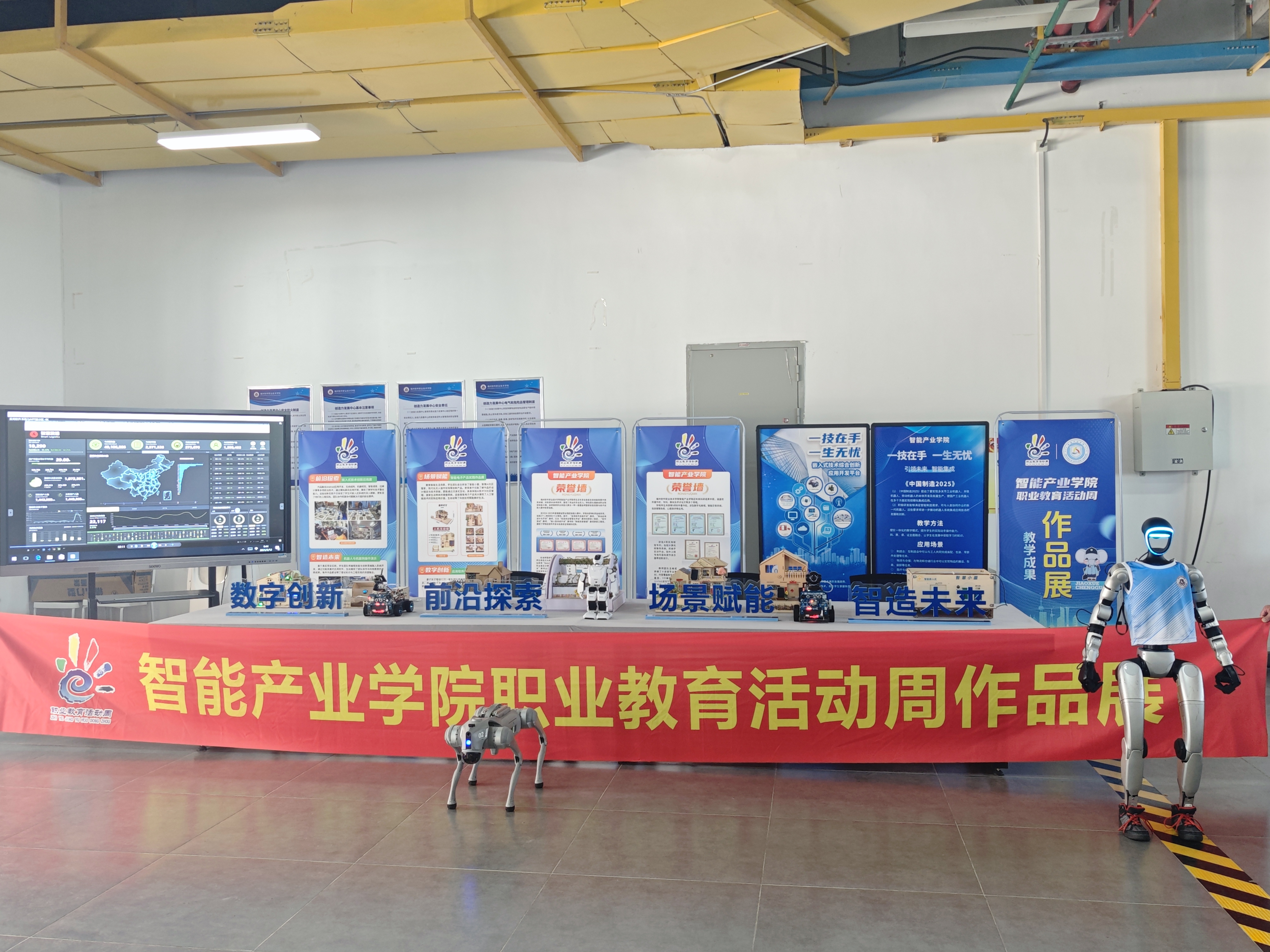 为展示我校师生职业技能水平,提高学生的实践能力与创新精神,2025年5月12日,智能产业学院在创造力发展实践中心举办2025年职业教育活动周教学成果作品展。本次作品展示围绕职业教育活动周主题“海丝匠心,职教扬帆”,旨在展示学生在人工智能技术应用、应用软件系统设计、嵌入式系统应用开发以及协作机器人技术等方面的成果,促进校内外交流与合作。