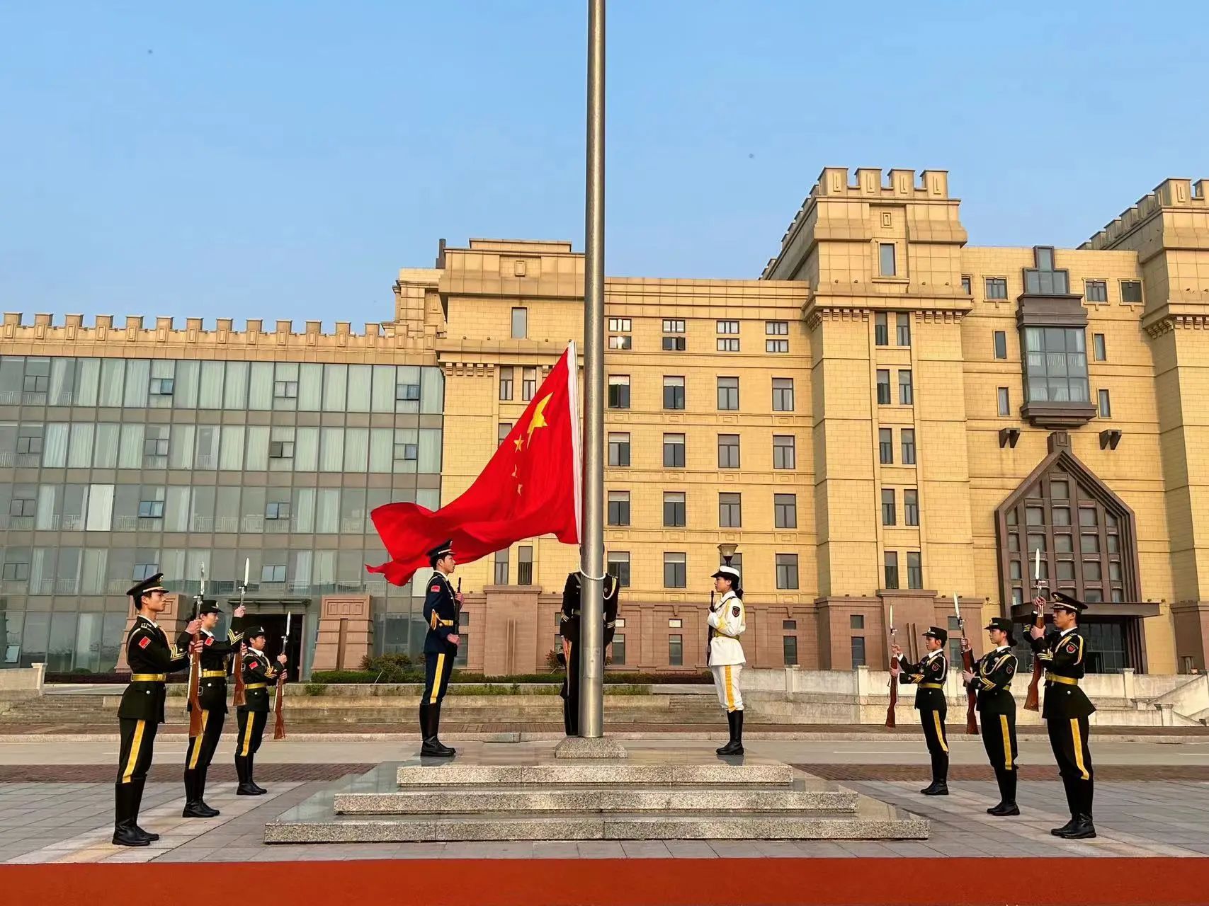 清晨七时,同学们整齐列队,升旗仪式正式开始。铿锵步伐响彻晨曦的寂静,金灿的日光照耀着国旗。国旗护卫队的同学步履铿锵,目光坚定,肩扛国旗,迈着庄严的步伐,护送五星红旗至国旗台。