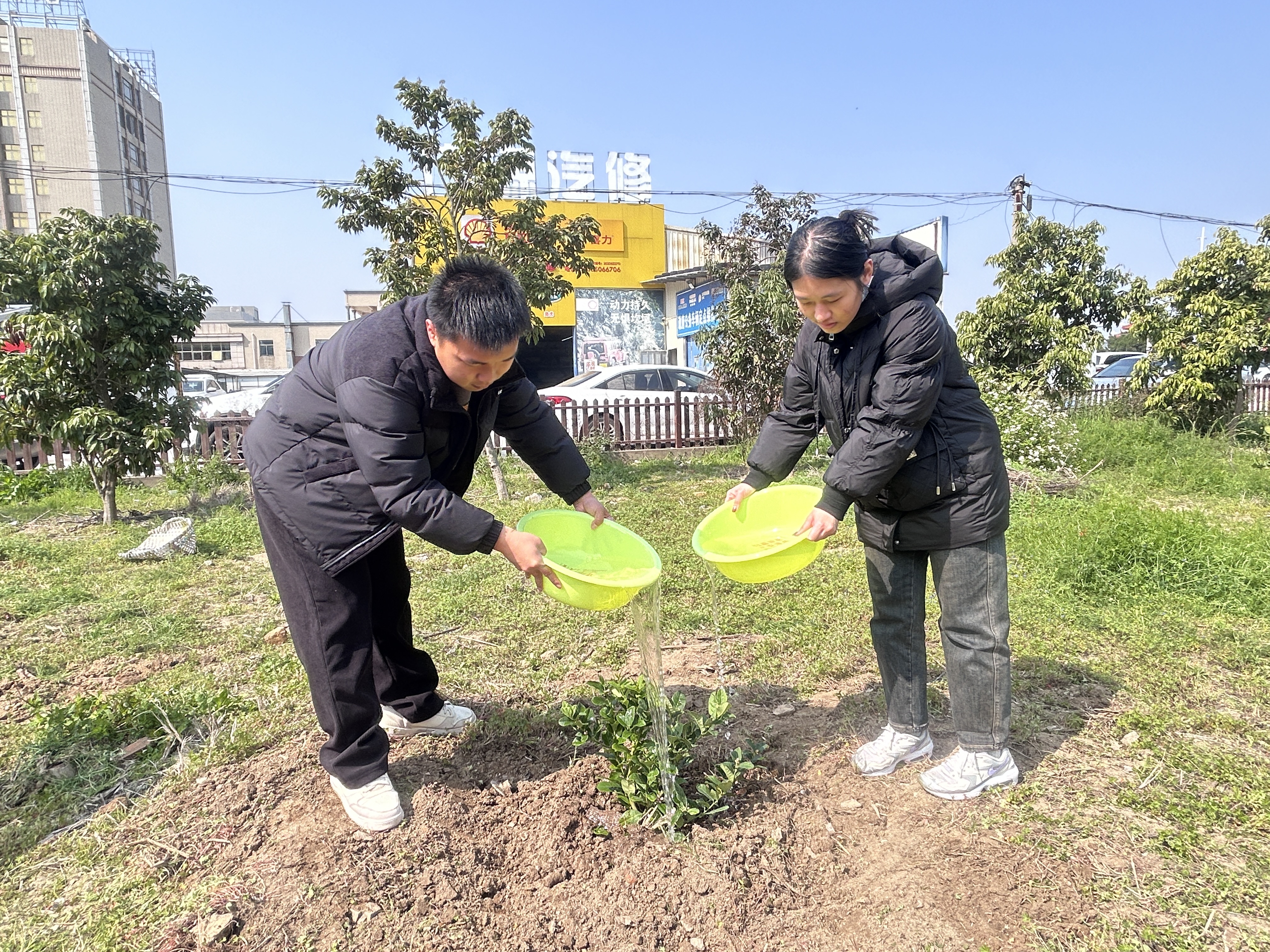 春风十里,不及一抹绿意。植树现场,志愿者们激情高昂,分工明确、干劲十足,挥锹铲土、培土围堰、提水浇灌、扶树正苗…每个环节都井然有序、配合默契。经过志愿者与老师们共同配合,树苗苗基实稳固、盎然挺拔,放眼望去,一片绿意盎然。