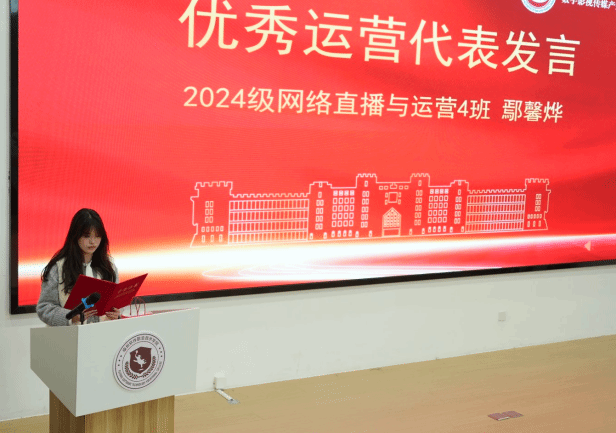 交流发言环节,优秀主播代表——2024级网络直播与运营1班张钰渲同学分享了在真实商战中锤炼表达能力的成长历程,感谢学校提供的实战平台,让自己实现从青涩到自信的跨越。优秀运营代表2024级网络直播与运营4班鄢馨烨同学则表示,通过参与项目全流程,深刻理解了市场逻辑与团队协作的重要性,未来将继续深耕行业,追求更高业绩。两位代表均表示,将带着这份荣誉与收获,在直播领域持续探索,不负学校培养。