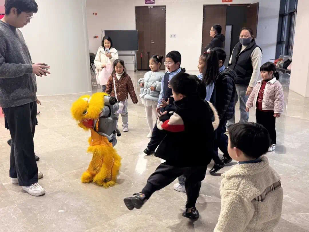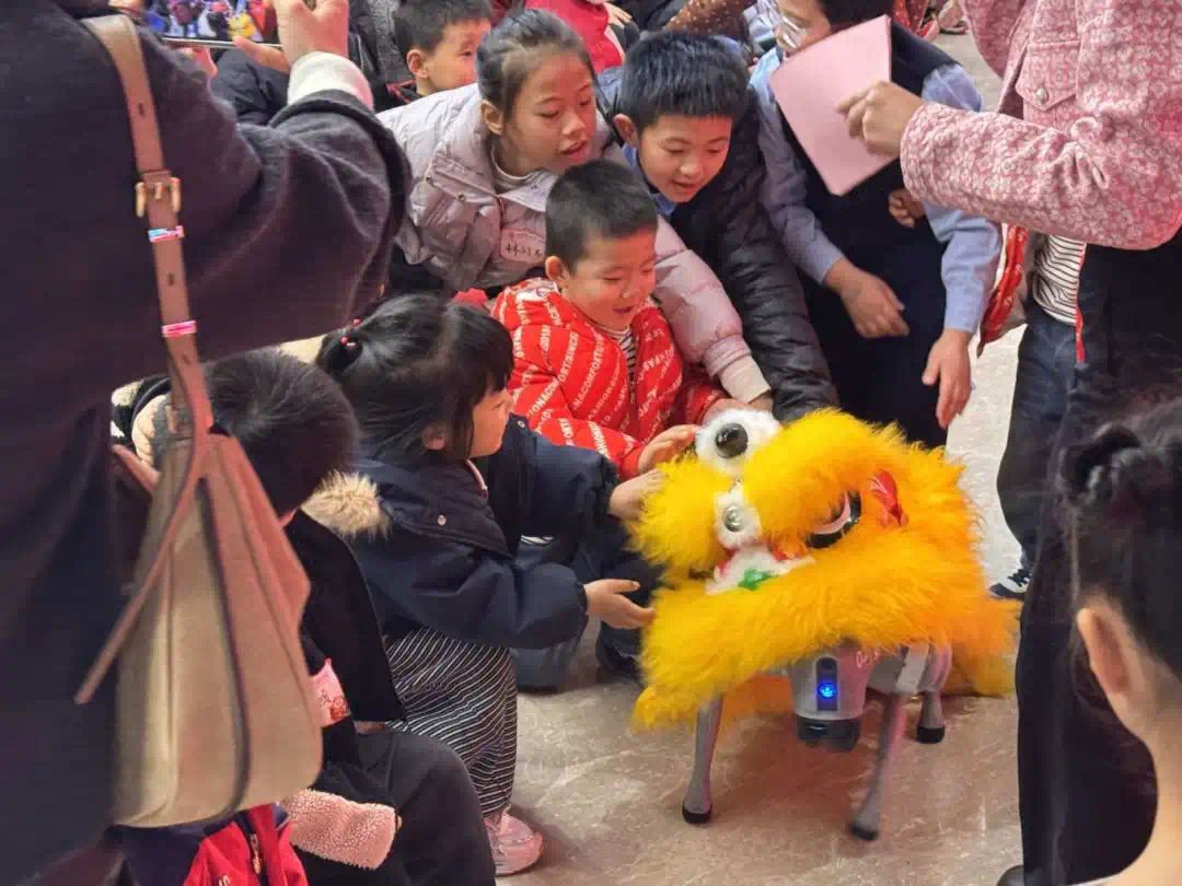 随着一阵热烈的欢呼,机器狗展演正式开场。我校学子操控着机器狗,流畅完成行进、翻滚、作揖拜年等动作——这既是企业实践中“精准控制”技能的延伸,也让冰冷的技术有了新春的温度。机器狗依次完成行进、翻滚、原地转圈等动作,最后稳稳做出“作揖拜年”的姿态——憨态可掬的模样搭配灵活敏捷的表现,瞬间点燃现场气氛,青少年纷纷围拢上前,眼神里满是好奇与惊喜,掌声与惊叹声此起彼伏。展演之余,我校学子在企业走访中学到的“技术科普思维”,邀请青少年互动,用通俗语言解析机器狗的传感器原理,指导大家亲手操控设备。在轻松的互动中,科技的魅力悄然传递,一颗颗崇尚创新的种子在新春的暖意里悄然萌芽。