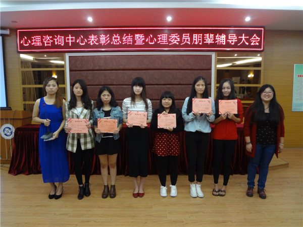 心理健康教育与咨询中心于20141125日晚19.00在学院报告厅召开“心理健康教育与咨询中心总结表彰暨心理委员朋辈辅导大会。”会议由王涛和李晶同学主持。参加会议的老师有:辅导员代表陈燕峰、雷翠丽、王李沙、李华、林智涵及院心理咨询中心主任吴爱梅老师。大会在主持人的精彩介绍后开始,参加会议的心理委员和心理会员都高度集中。本次大会有五项议程:心理委员受聘、颁奖典礼、心理协会会长对13-14年度心协工作进行总结级下一年度工作计划的报告、心理协会副会长进行朋、辅导培训、心理指导老师总结发言。