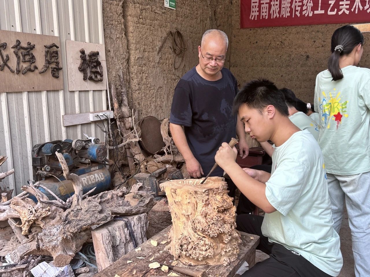 “同学们,大家知道木雕、根雕、根艺有什么区别吗……”在屏南县乡村文艺创作、宁德市级非遗项目传承、福建省终身学习品牌等基地,中国传统工艺美术大师、福建省工艺美术大师、宁德市特支人才(文化名家),宁德市非遗传承人张长青老师首先为我们介绍了“非遗根艺”的故事。