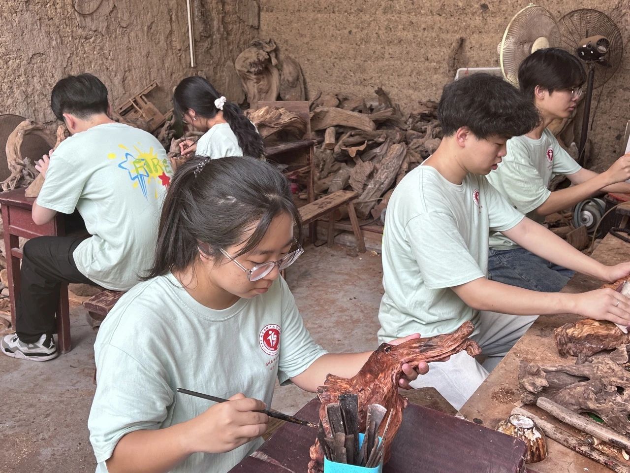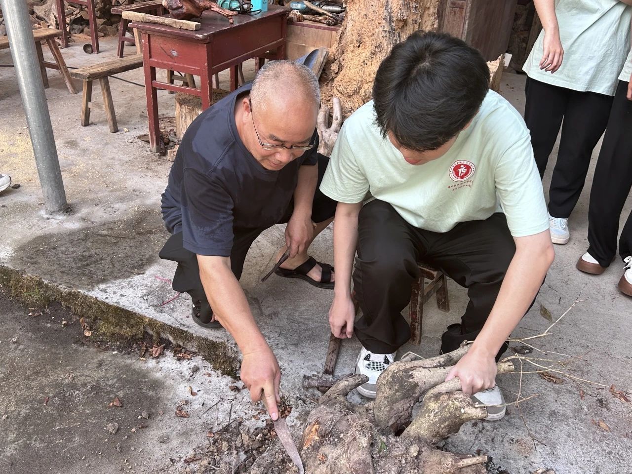 “选材、清土、去皮、设计、雕刻、打磨……”我们随张老师前往了根艺工作室,在他的带领下我们体验了树根到根艺作品背后所涵盖的故事,切身体会到了根艺之所以成为宝,贵在天然,难在创新。在实践学习的过程中张老师就如何弘扬传承根艺文化、如何使非物质文化遗产绽放出更加迷人的光彩赋能乡村振兴和师生共同探讨。让实践队员进一步增强文化自觉,坚定文化自信,用青春力量赋能乡村振兴。