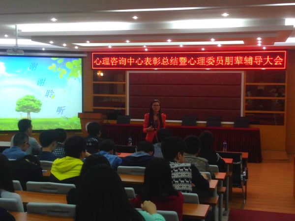 心理健康教育与咨询中心于20141125日晚19.00在学院报告厅召开“心理健康教育与咨询中心总结表彰暨心理委员朋辈辅导大会。”会议由王涛和李晶同学主持。参加会议的老师有:辅导员代表陈燕峰、雷翠丽、王李沙、李华、林智涵及院心理咨询中心主任吴爱梅老师。大会在主持人的精彩介绍后开始,参加会议的心理委员和心理会员都高度集中。本次大会有五项议程:心理委员受聘、颁奖典礼、心理协会会长对13-14年度心协工作进行总结级下一年度工作计划的报告、心理协会副会长进行朋、辅导培训、心理指导老师总结发言。