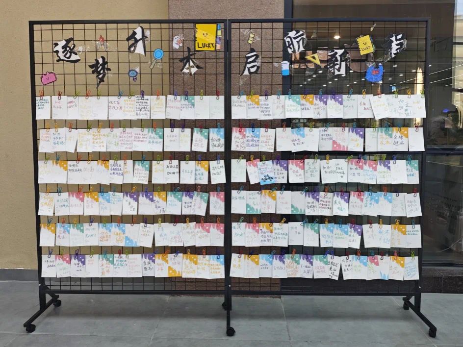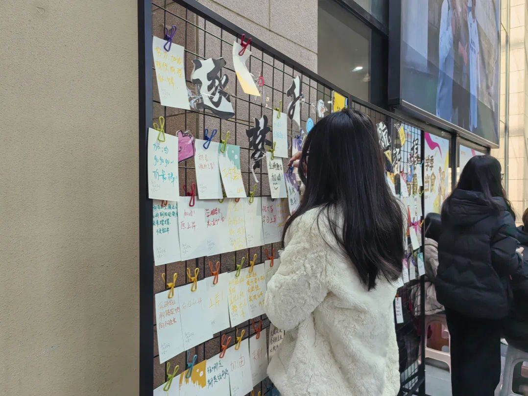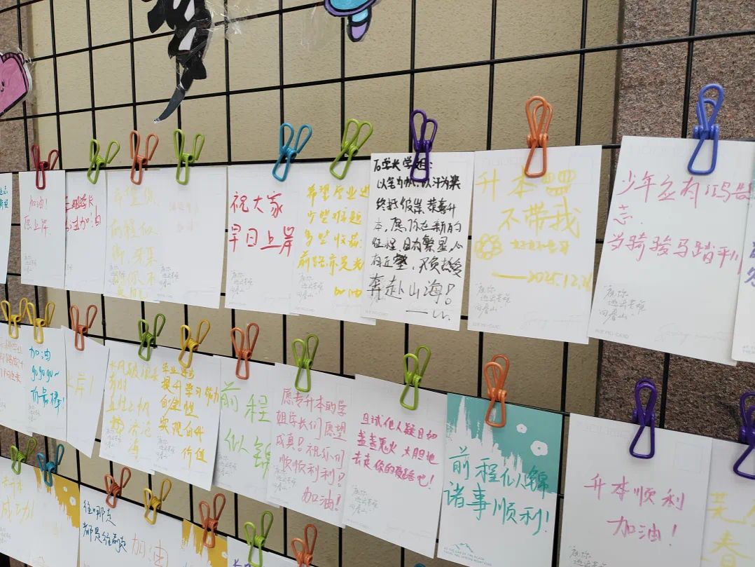 与此同时,在校学子同样专注投入,俯身落笔时满是真诚。他们将对学长学姐的祝福与加油写进寄语,也借着笔墨梳理自己的学习目标、立下青春誓言,字里行间的鼓励传递着同窗情谊,更让自己在书写中坚定了前行方向,明确了成长路径。