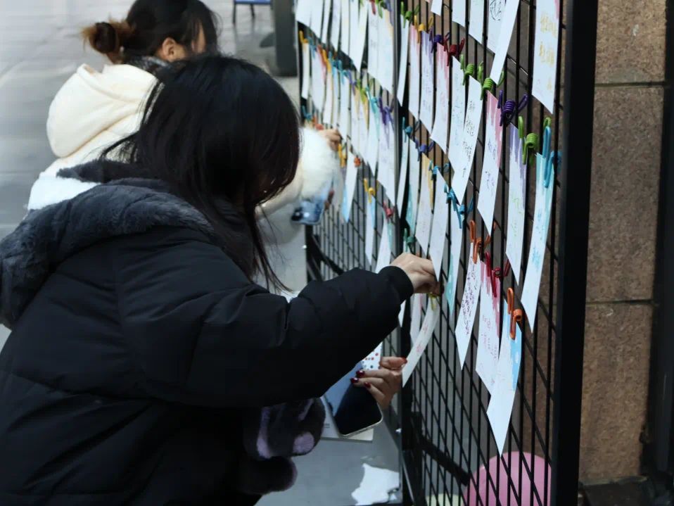 五彩斑斓的明信片层层叠叠,一张张承载心意的卡片被整齐排列在展览板上,成为校园里一道温暖的风景线。