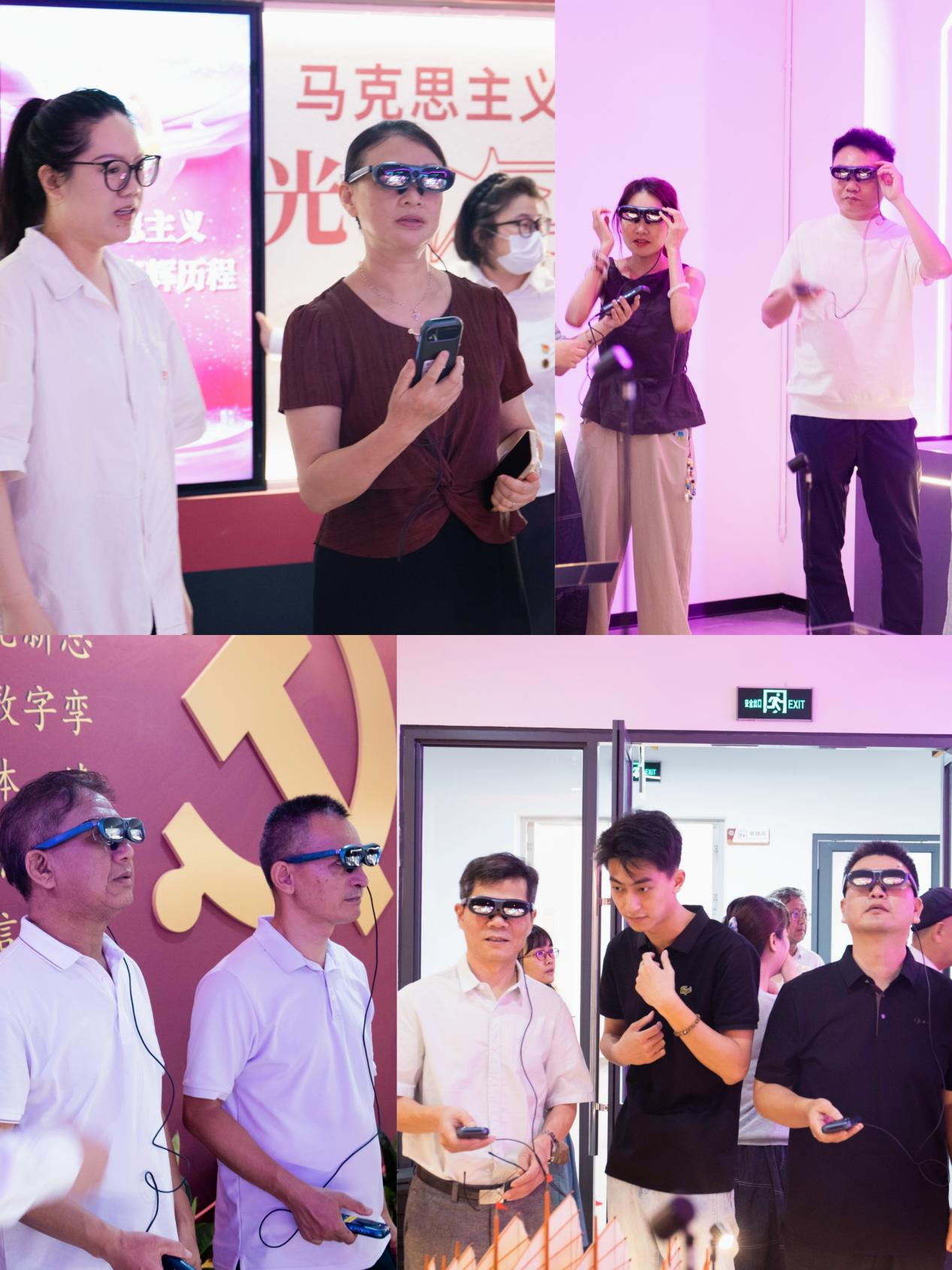 与会人员参观基地元宇宙AR体验厅、思政滑轨屏、沉浸式体验厅、数字资源工场以及文化走廊
