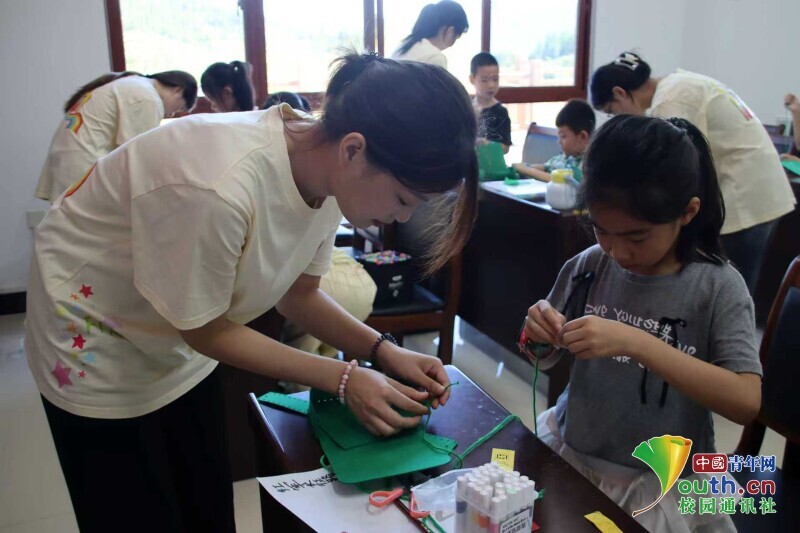 图为实践队员帮助小朋友制作红军包。李小阅 供图