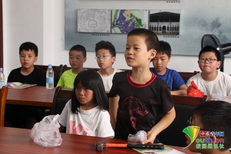 图为小朋友们在认真的敲打自己的拓染作品。 占圣雯 供图