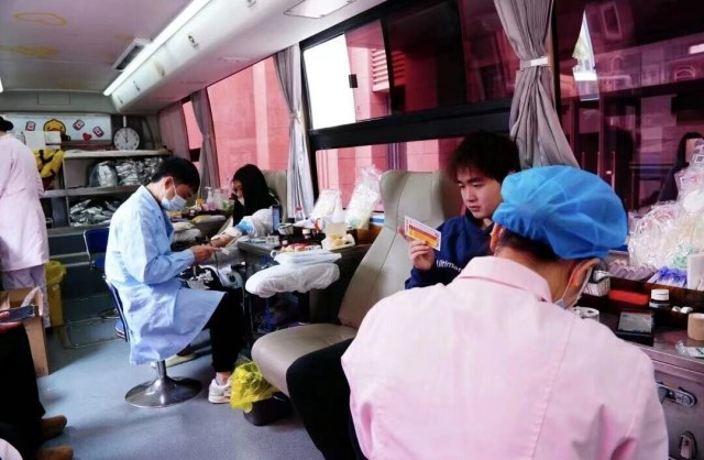 图为达到献血标准的师生于献血车内进行献血。中教网通讯员 许玉立 摄