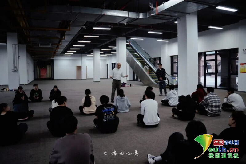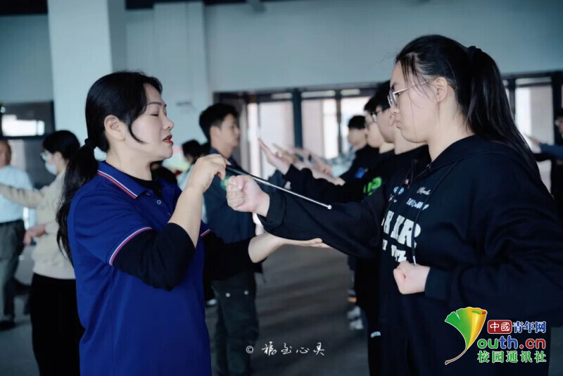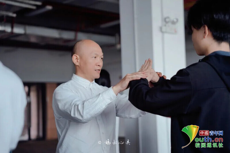 图为王国文老师手把手教授同学冲拳摊手、摊手护手等动作要领。中国青年网通讯员 林沐含 摄