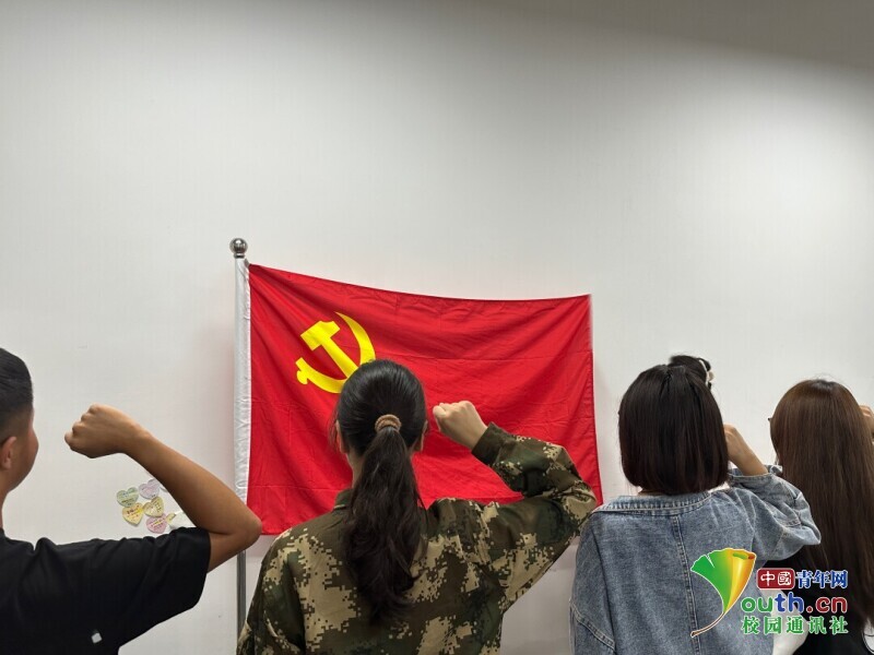 图为现代通信产业学院学子在党旗前重温入党誓词。中国青年网通讯员 蒋宛真 摄