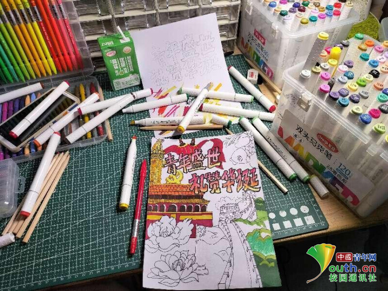 图为游戏产业学院“愿以青春之名 书写清澈之爱”书法绘画庆国庆活动。中国青年网通讯员 邓文杰 摄