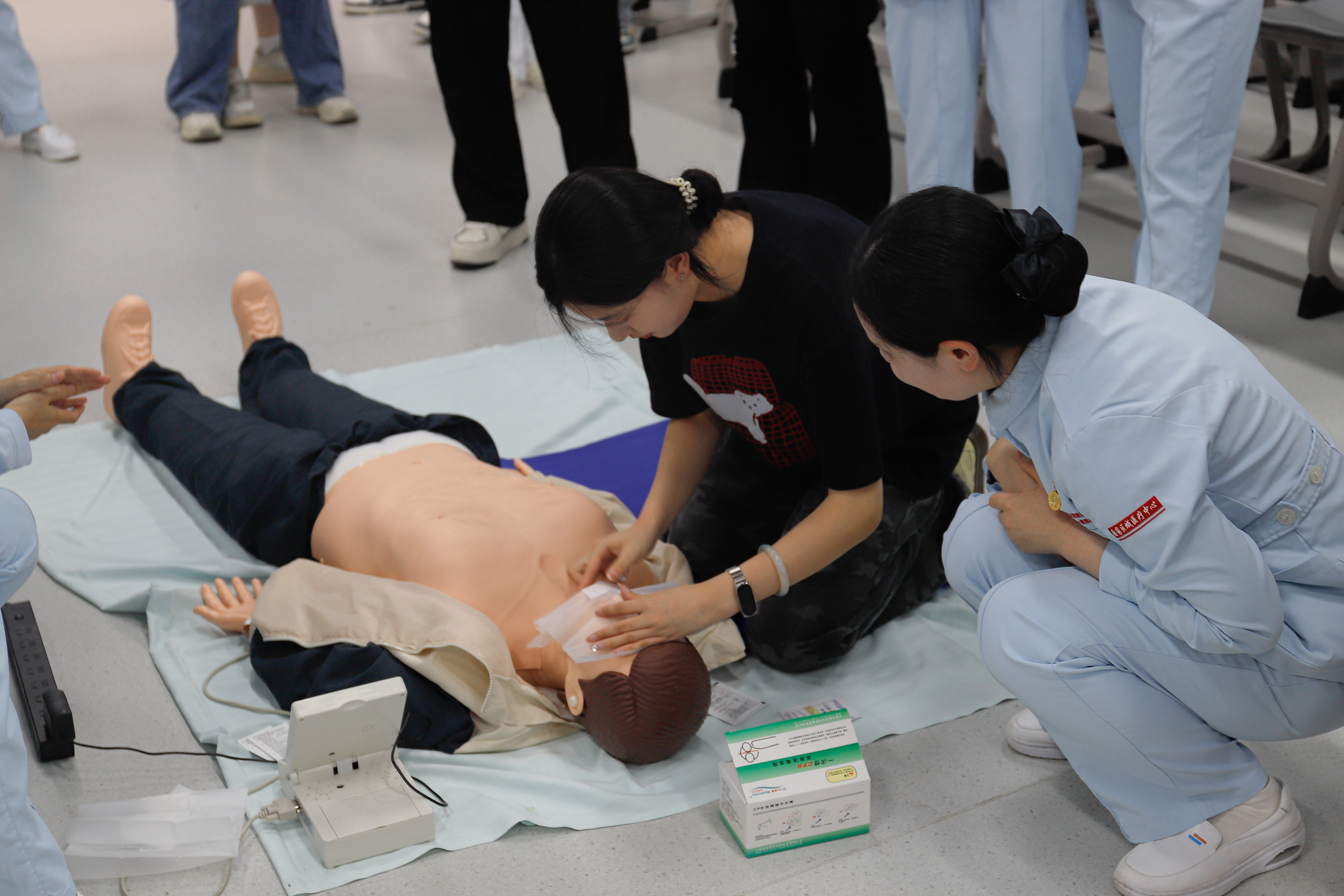 情景考核环节中,在医护人员的专业指导下,我校同学现场演示了心肺复苏(CPR) 和 AED 的使用流程,既检验了学习成果,也让在场师生更直观地看到急救技能的实际应用过程,进一步加深对急救知识的理解。