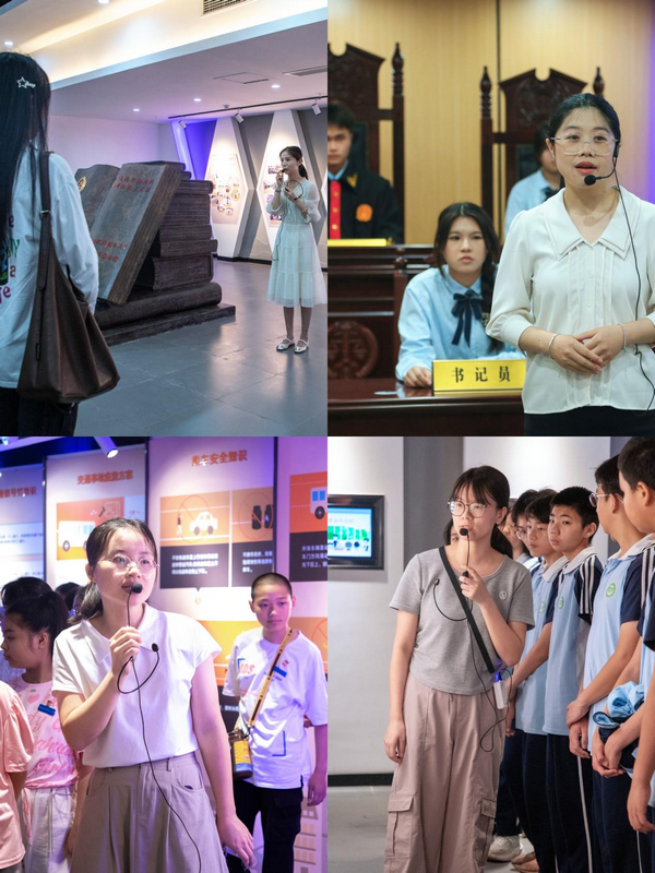 在实践教学中,四所大中小学,“大手”牵“小手”,以“法治教育”为引,同上一堂行走的“法治”思政课。在宪法宣誓台前,福州软件职业技术学院的苏莉佳老师给同学们带来了一堂题为《学宪明德,法润人心》的精彩思政课,苏老师采用问题链教学,巧妙地将宪法文本元素融入其中,以法润心,以德润情,让同学们在潜移默化中感受到宪法的威严和力量。在模拟法庭,长乐职业中专学校陈燕琼老师以《“模法”少年,与法同行》为题,结合角色扮演,围绕“校园霸凌”、见义勇为、正当防卫等法律问题,高度还原了真实的庭审过程,带来一堂法情融合的沉浸式普法课。在国家安全科普长廊,来自长乐区城关中学陈欣怡老师从国家安全的概念入手,以《国家安全,你我共筑》为主题,寓法于情、寓法于理,辅以案例,用一问一答巧妙串联,为同学们呈现了一堂精彩的沉浸式、问答式的“国家安全”思政课。随后,长乐区里仁小学的周懿老师用讲故事口吻,通过互动问答的方式,为孩子们讲解交通安全注意事项,提醒孩子们交通出行时要遵守交通法规,并结合真实案例,带领孩子们一起模拟交通生活情景,将安全知识转化成生活经验,将交通安全铭记于心。