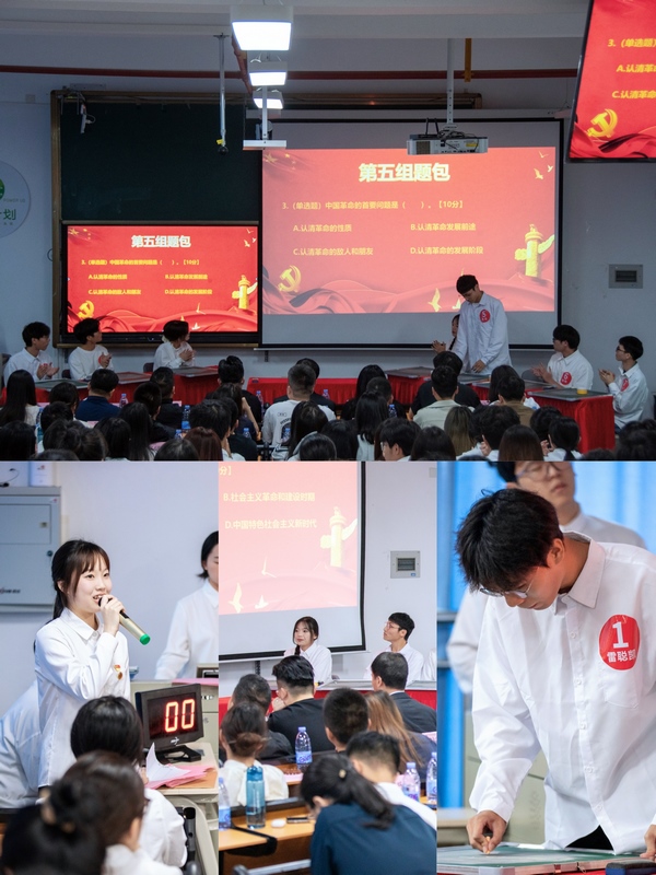 为深入学习贯彻习近平新时代中国特色社会主义思想,持续开展大学生马克思主义自主学习行动计划,进一步提高我校学子的思想政治素养,营造“以赛促学、以学促思、融会贯通”的良好氛围,引导青年学生做有信仰、有理想、有本领、有担当的新时代青年,6月4日下午,我校第二季大学生学习马克思主义理论“一‘马’当先”知识竞赛决赛在教学楼A506举办。党委办公室、学生工作部(处)、校团委、马克思主义学院等单位负责同志,晋级决赛选手、学生代表共200余人参加竞赛活动。