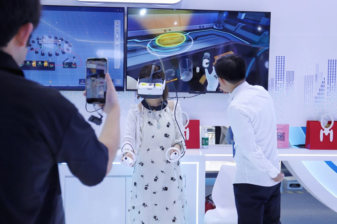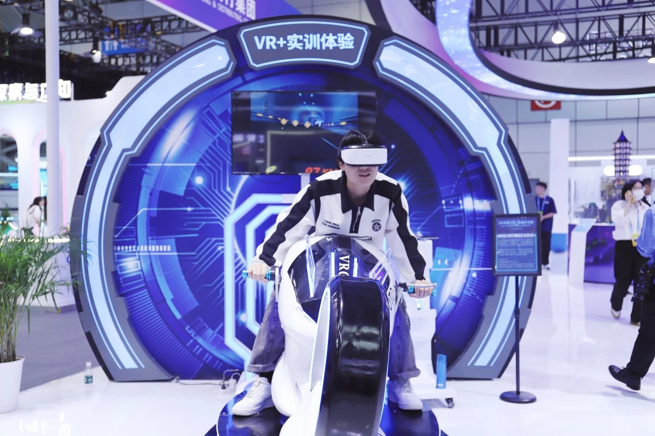 图为VR摩托车竞速项目,是“职教出海”项目打造的VR实训室设备之一,是展会上的热门体验项目