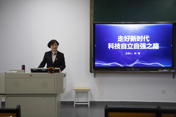 林莺结合习近平总书记关于新质生产力的重要论述,从“世界科技竞争局势”、“我国科技机遇挑战并存”、“加快科技自立自强步伐”三个方面进行了系统阐述。她以探月探火、载人航天、“天眼”远望、深地探测、超级计算机、人工智能等不断涌现的中国科技“热词”为引,梳理了我国在前沿科学技术研究斩获的重大创新和突破,并为同学们分析了当前面临的挑战。