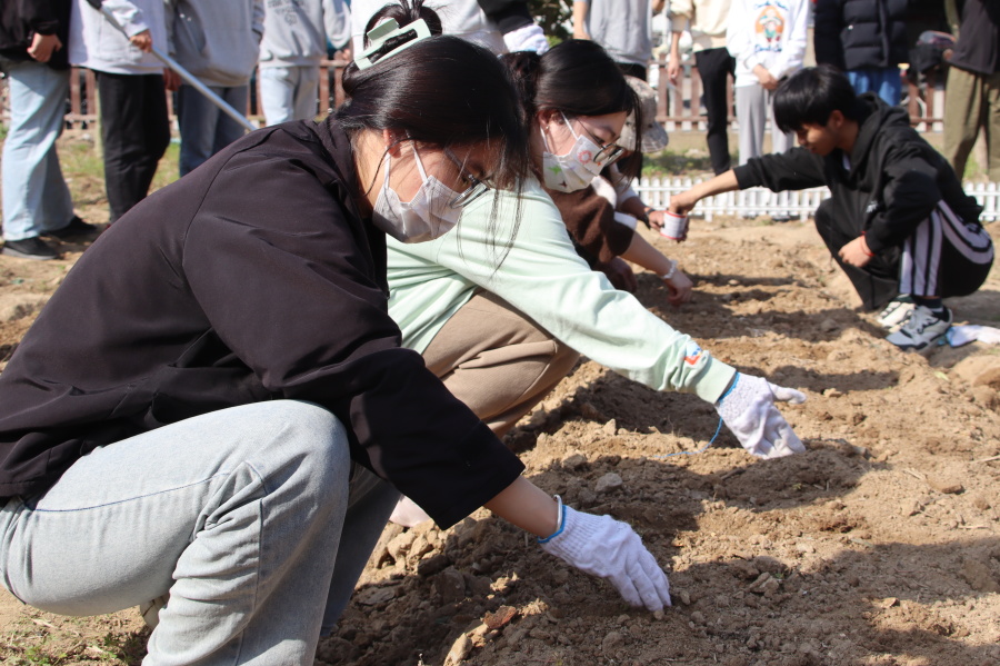 播种过程中,数字金融产业学院邀请拥有丰富种植经验的社区居民提供专业指导,带领学生参与播种、育苗、浇水、施肥、病虫害防治等劳动实践。在社区居民、老师和学生的共同配合下,分别进行翻松土壤、平整土地、播撒种子、施肥、培土围堰、浇水灌溉、每个环节都有条不紊,默契协同。