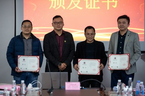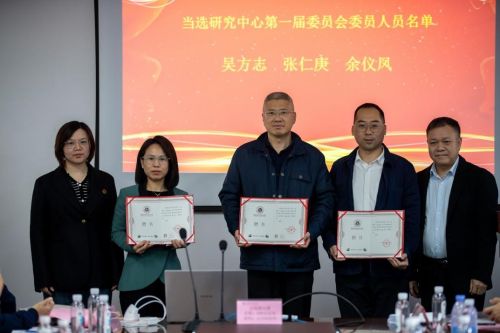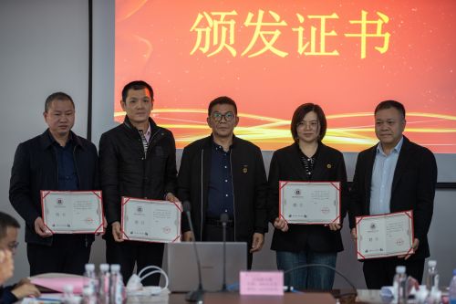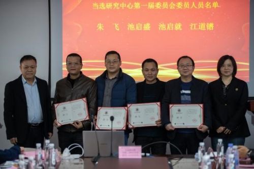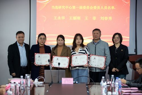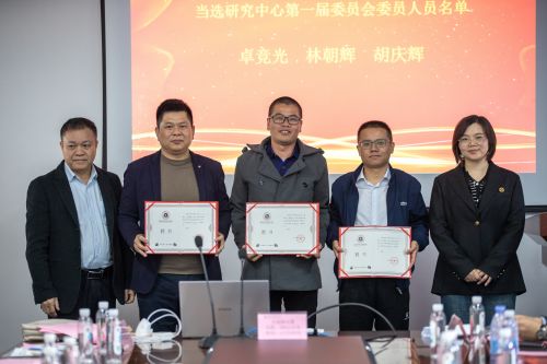 柯建琳校长助理为当选为研究中心办公室主任的王德成副院长,办公室副主任的聂小龙和池亚徽先生颁发证书。