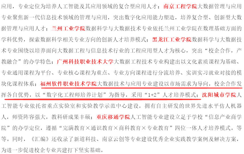 近日,全国高校人工智能与大数据创新联盟牵头组织编写的《全国高校人工智能大数据区块链学院(专业)基本概况汇编(2022版)》(以下简称《汇编》)新鲜出炉,我校大数据技术与应用专业以市场需求为导向,以”数字化工程师培养计划”为指导,采用“1+2”人才培养模式,校企合作发挥各自优势的办学理念入选。