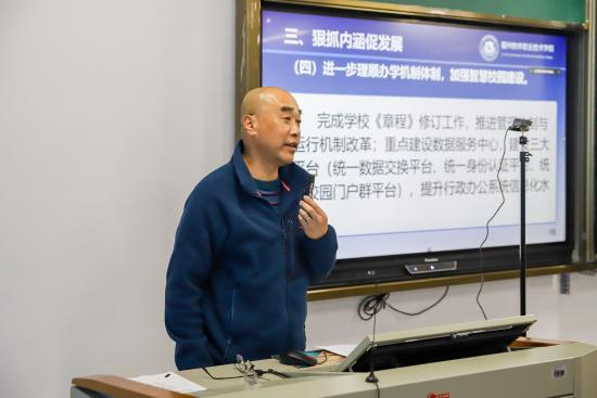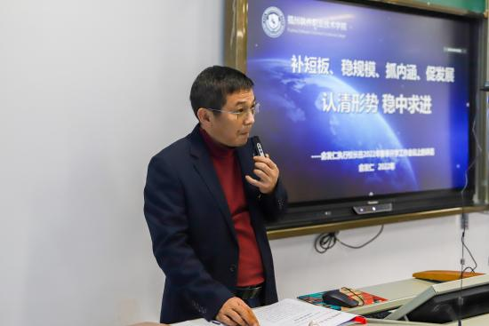 会上,俞发仁执行校长在部署2022年教育教学工作中,围绕“补短板、稳规模、抓内涵、促发展”,提出三点意见:一是认清形势补短板。认清职业教育发展形式,坚定投身职业教育信念;认清学校特色发展动能,坚定学校跨越式发展信心;认清学校快速发展基因,精准发力真抓实干补短板。二是稳定规模重质量。学校从2016年9月开始,对专业进行调整,形成了以新一代信息技术和文化艺术设计为主体的具有数字特色的专业体系;从现代职业教育质量提升计划中央专项资金下达我校专项资金逐年增多;办学规模不断扩大,今年在校生将达到万人。学校要在稳定规模上下功夫,在提高质量上花气力。三是狠抓内涵促发展。全面坚持党的领导,持续加强党的建设;深化教育教学改革,落实立德树人根本任务;加强学生教育与管理,全力服务学生成长成才;进一步理顺办学机制体制,加强智慧校园建设;拓展开放办学与社会服务,提升国际交流水平;继续深化教育评价改革,启动二轮评估工作。