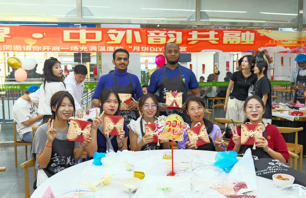 活动现场,不同国家的学生一边制作,一边分享各自家乡团圆糕点的故事。中方师生也热情解答着关于中秋习俗的提问,并好奇了解他国的节日传统。笑语声中,不同口音交织,不同文化在面团与馅料的融合中悄然对话。当一个个饱满的月饼在盘中整齐排列,空气中弥漫的不仅是饼皮与馅料的甜香,更是文化交流与情感联结的温暖气息。