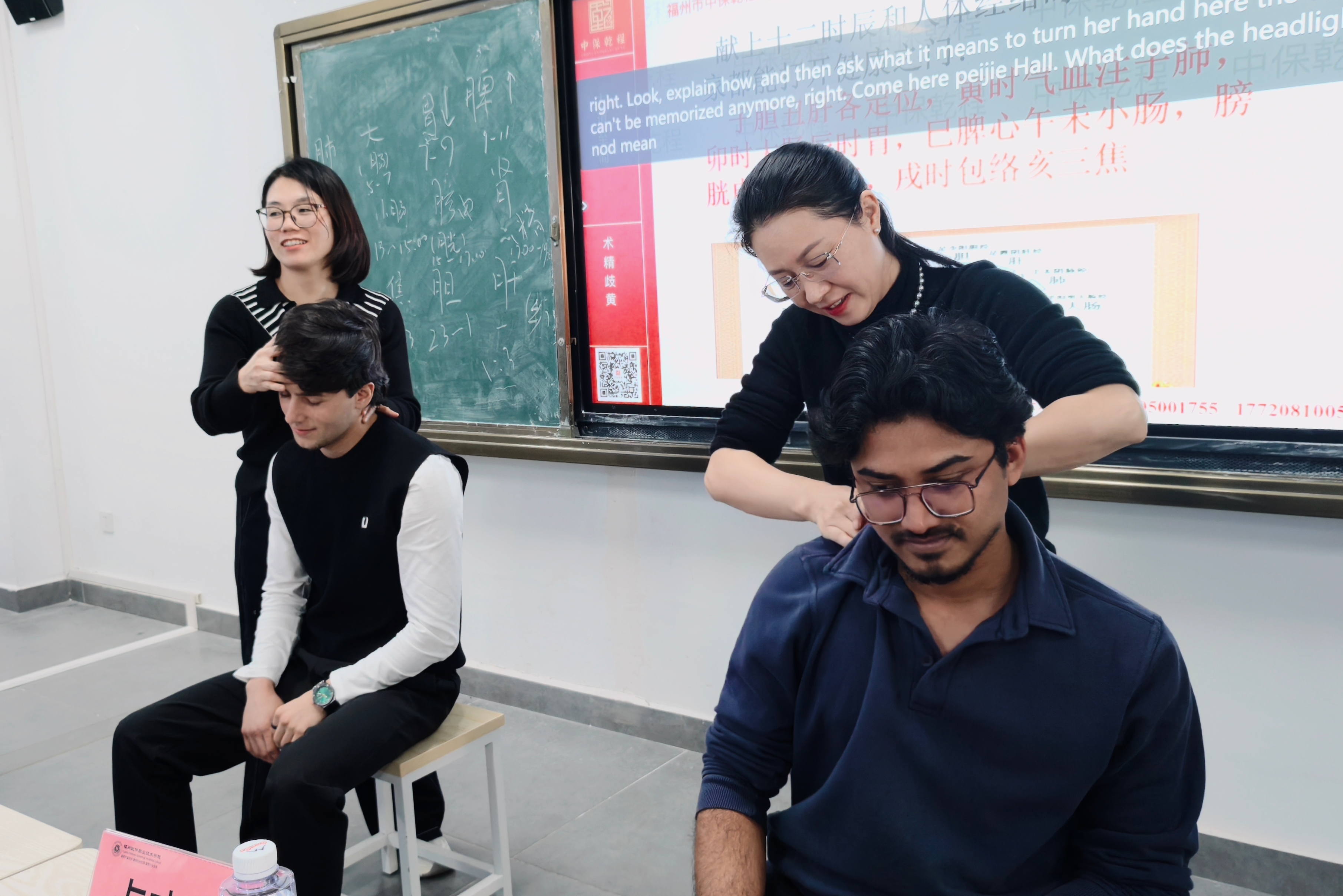 随后,福建省鉴定中心技能人才评价质量督导员、保健按摩考评员卢晓艳携其专业团队,为师生呈现了一场生动且深刻的中医推拿与穴位保健技艺展示。卢老师从中医理论入手,深入浅出地讲解了常见穴位的功效与按摩手法,并在互动环节中指导学生现场体验。国际学生们踊跃参与,在“一对一”实操中切身感受中华传统保健技艺的独特魅力。