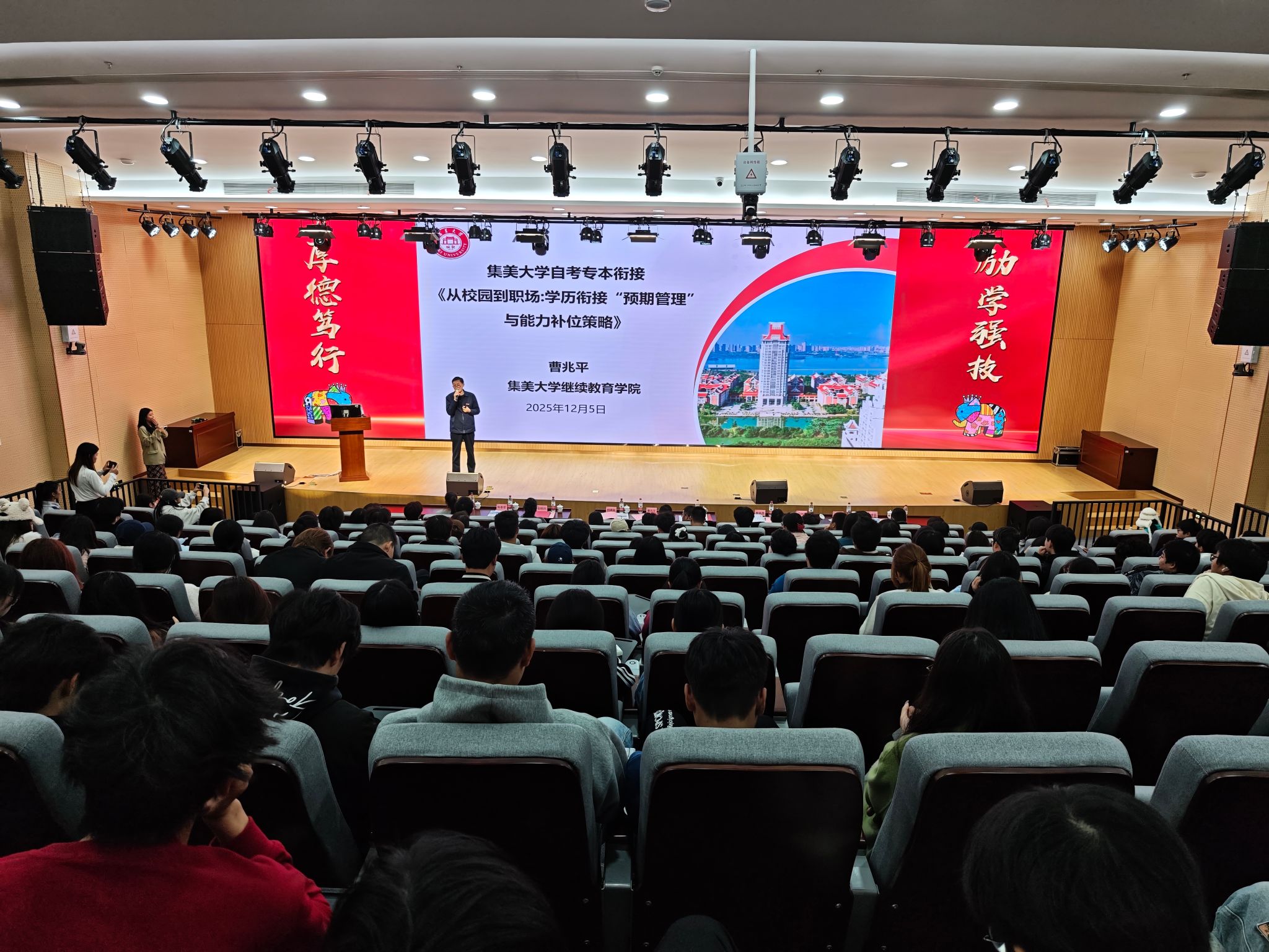 开班仪式后,曹兆平院长带来了专题讲座《从校园到职场:学历衔接 “预期管理” 与能力补位策略》。他结合当前高校毕业生就业形势与职场竞争特点,深入解读学历在职业发展中的重要性,分享了“拆解学习任务、设立阶段性目标”等学历提升预期管理办法;同时从信息检索、沟通表达、团队协作等维度,为新生们提供了具体的职业能力提升策略。讲座兼具理论高度与实践指导性,让新生对学习规划和未来职业发展有了更清晰的认知。