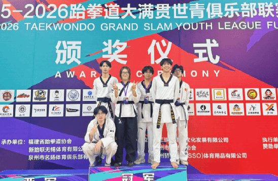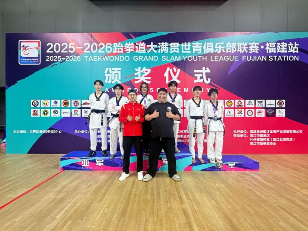 2025年12月6日至7日,由福建省跆拳道协会组织的2025-2026年跆拳道大满贯世青俱乐部联赛在泉州市晋江市第二体育中心1号馆圆满落幕。我校冯一龙、颜世童两位老师带队出征,6名参赛学子奋勇拼搏、不负众望,全部斩获名次,最终以1金2银3铜的优异成绩为学校争光添彩!