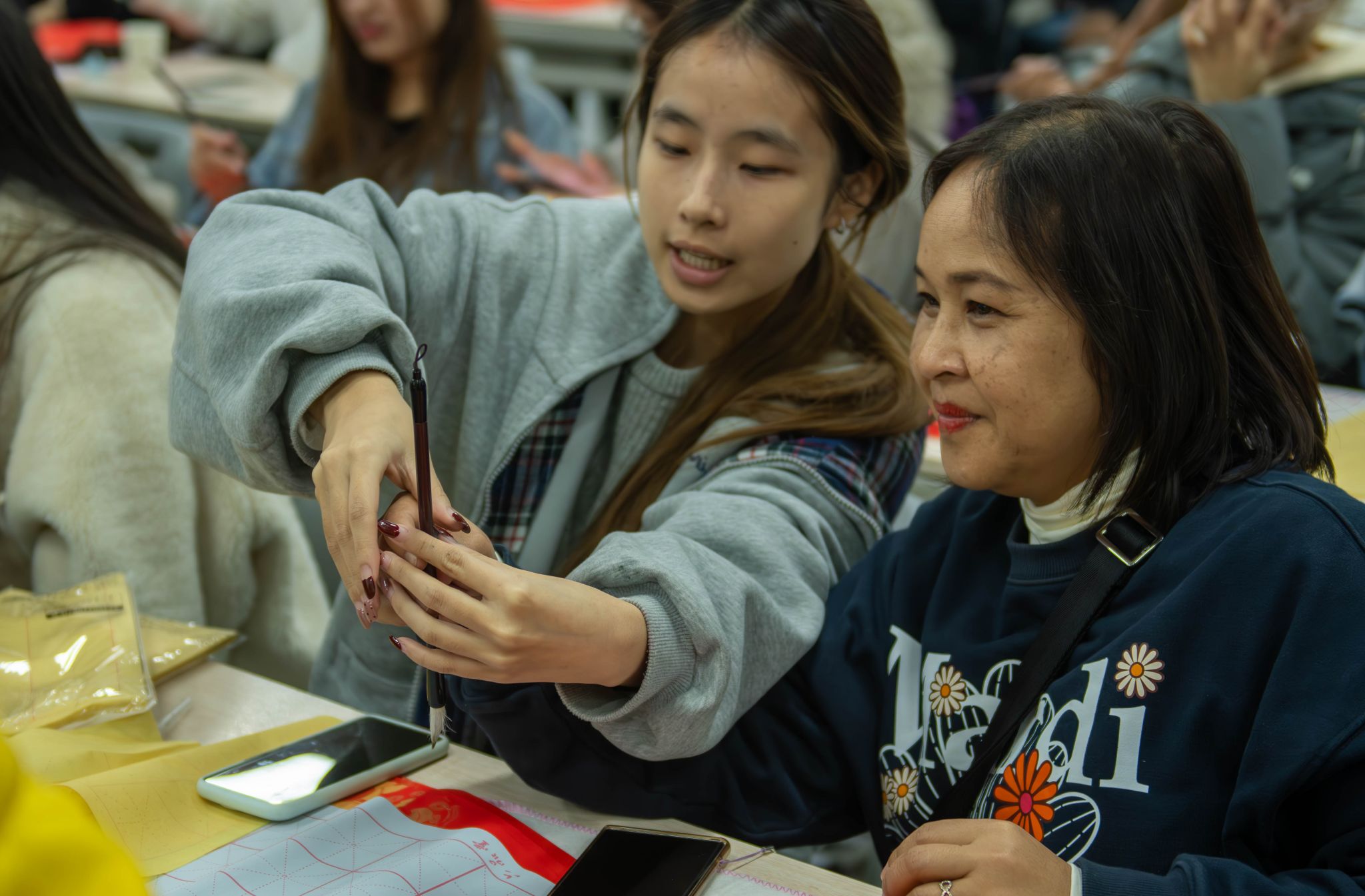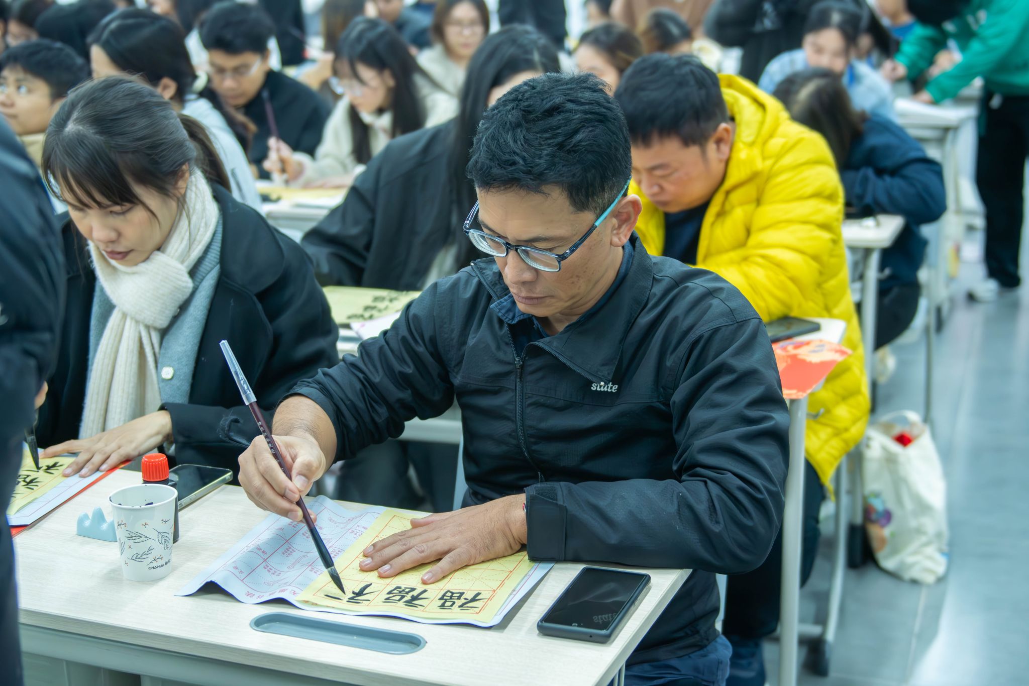 实践创作环节,学员先在练习纸反复练习“福”字技巧,熟练后在红色纸张正式书写。尽管多为首次接触毛笔书法,学员们仍全神贯注,一个个饱含诚意的“福”字跃然纸上,现场创作氛围浓厚。