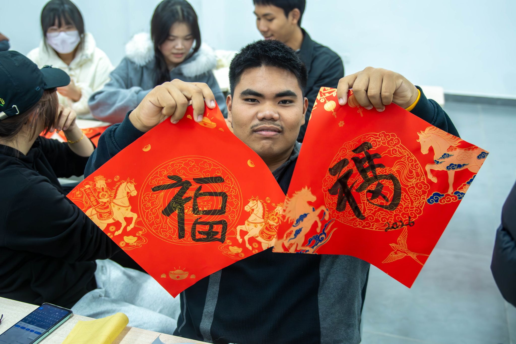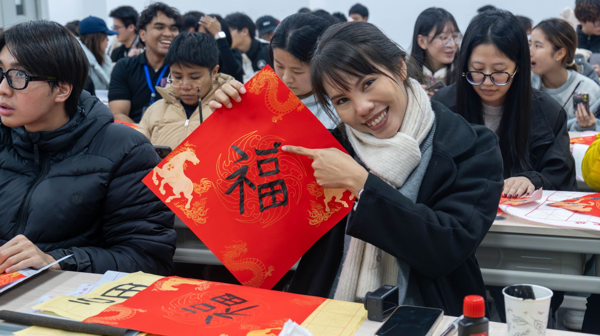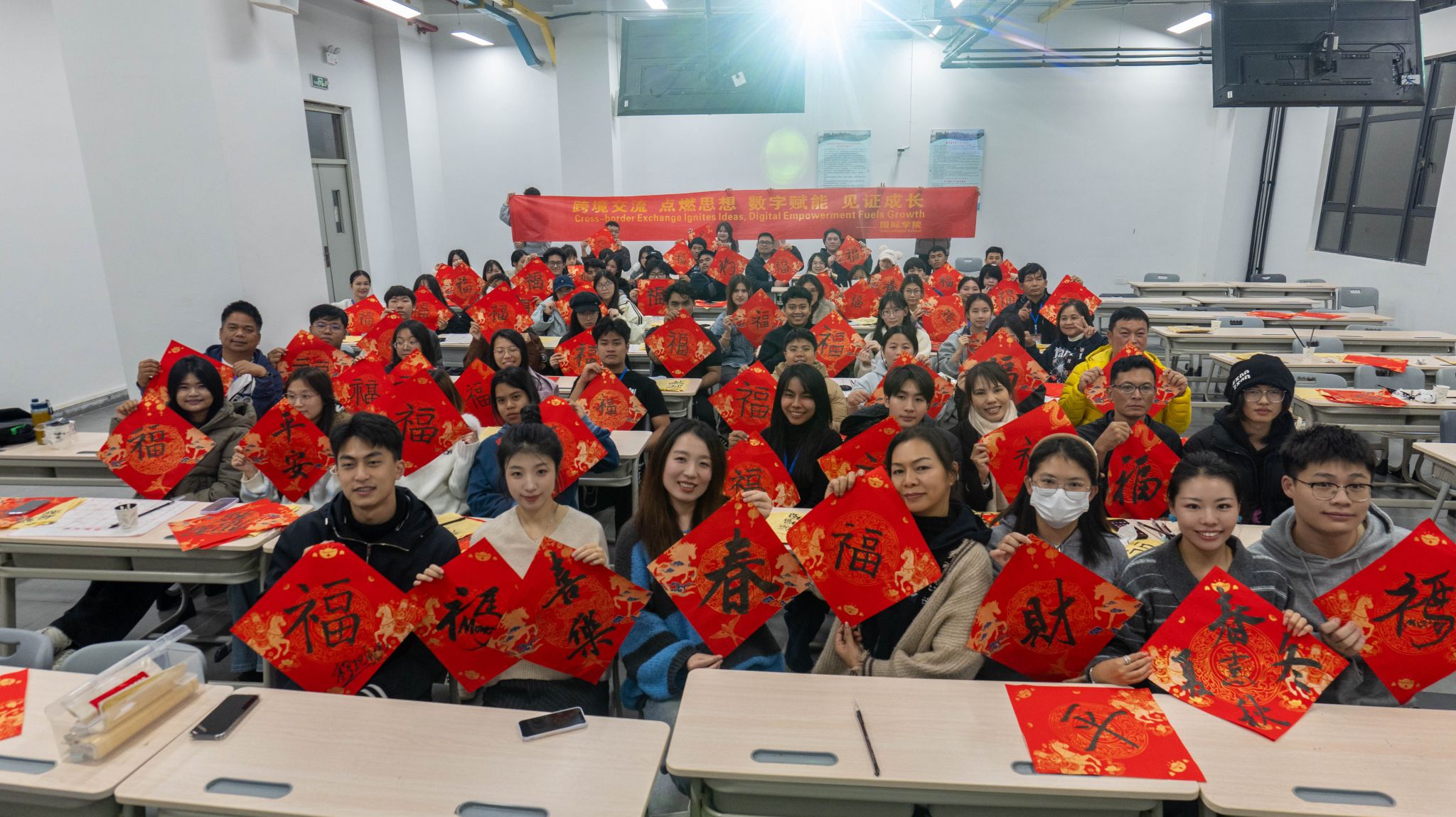 冬至阳生,岁回律转。在这个承载团圆祈福寓意的传统节日夜,福州软件职业技术学院国际学院为 38 名中泰职业技能培训泰国学员举办书法写 “福” 字文化体验活动。我校游戏产业学院志愿者全程协助,以笔墨为桥,让学员沉浸式感受中国书法魅力,传递跨文化温暖与祝福。